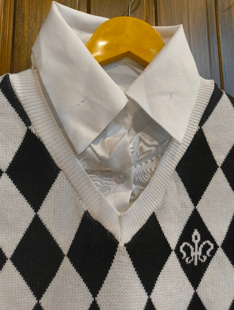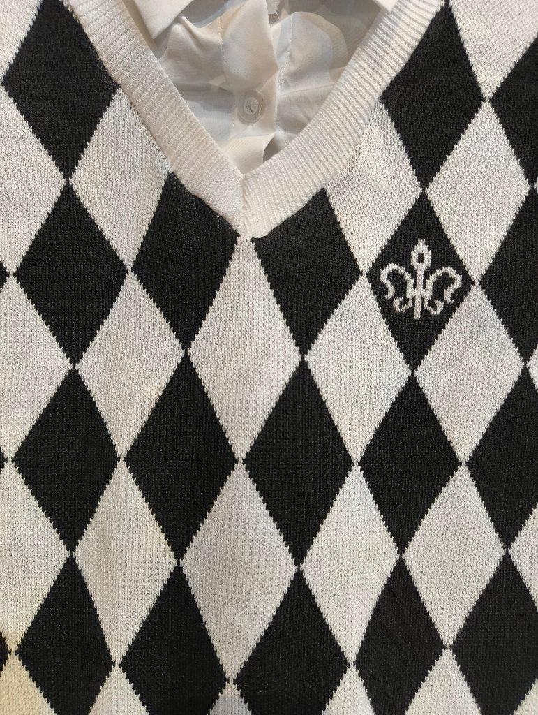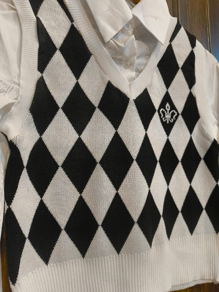 A stylish argyle pattern sweater vest featuring a classic V-neck design, layered over a crisp white collared shirt. This versatile piece combines comfort and sophistication, perfect for both casual and semi-formal occasions.