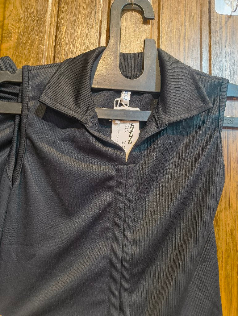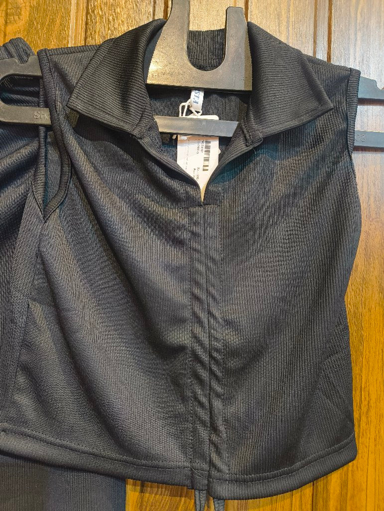 A stylish black co ord set featuring a cropped top with a collar and drawstring, paired with matching pants designed for comfort and flexibility. Ideal for workouts or casual outings.