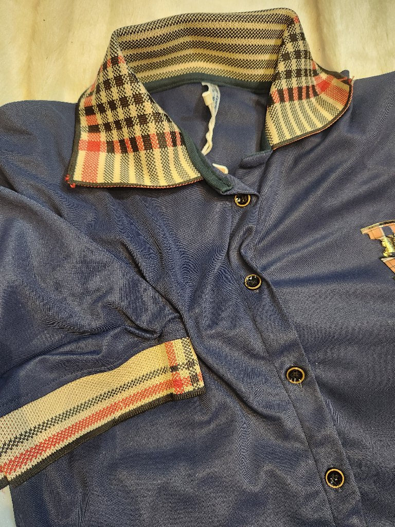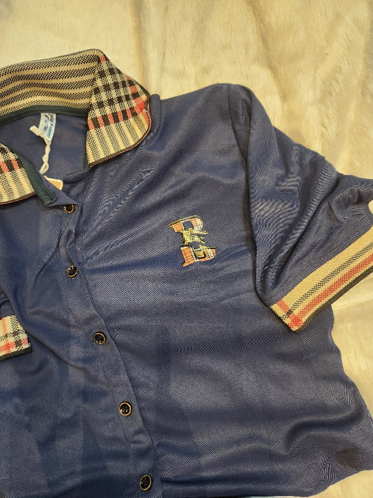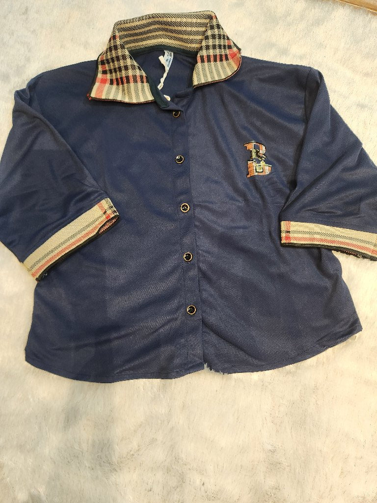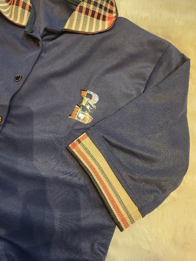 A stylish casual button-up overshirt featuring a navy blue body with a distinctive plaid collar and sleeve cuffs. The shirt includes a button closure and an embroidered logo on the front, making it a perfect addition to your summer wardrobe.