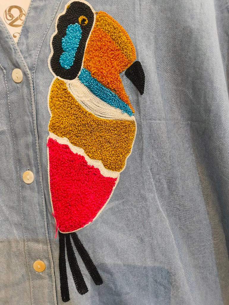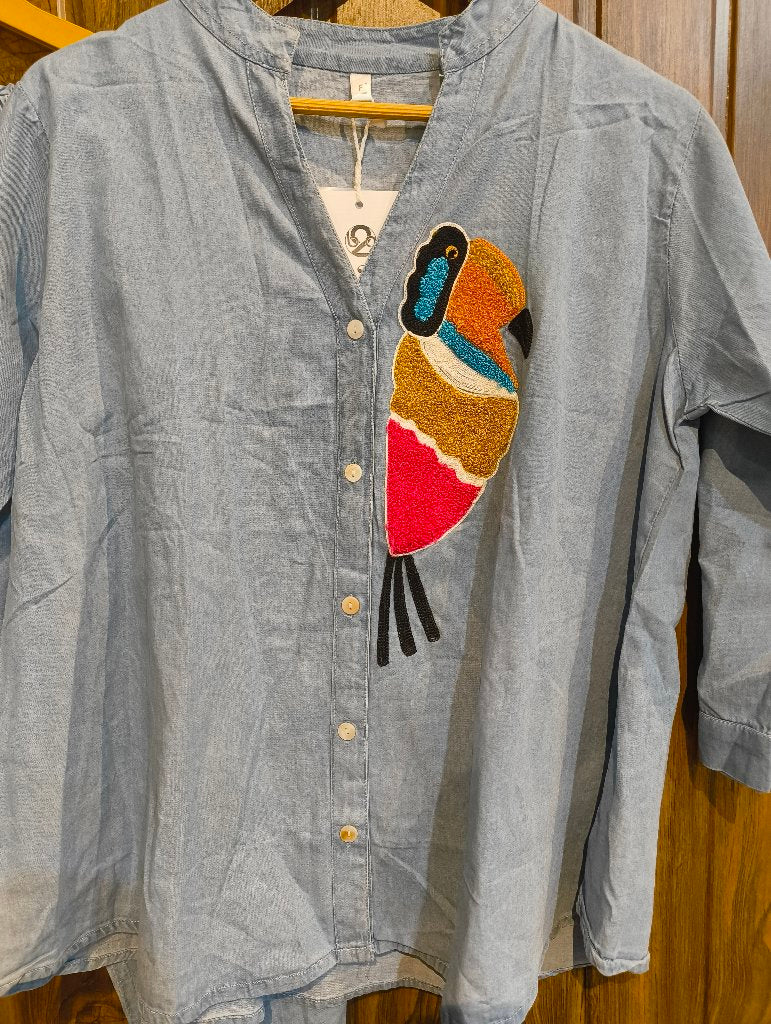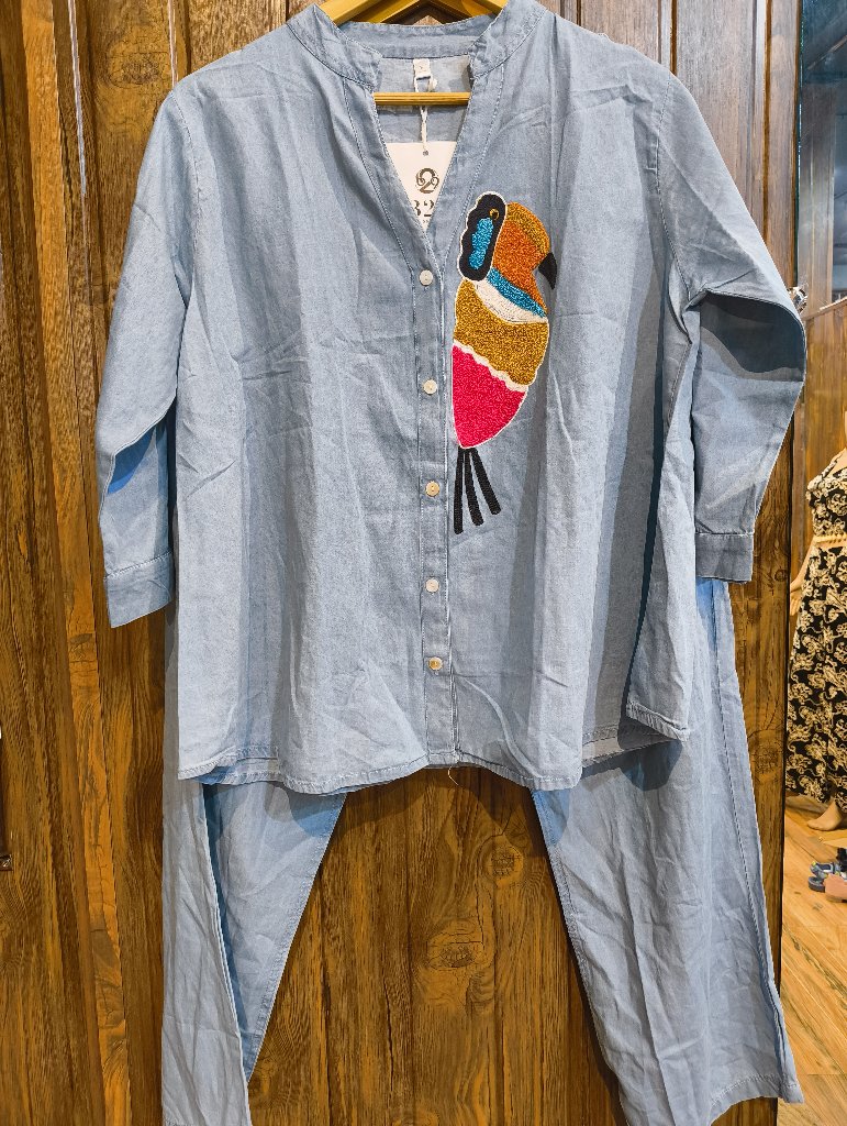 A stylish casual set featuring a denim top with a colorful bird embroidery and matching elastic waist pants. The top has a button-down front and a relaxed fit, perfect for summer outings. The pants are designed for comfort with an elastic waistband.