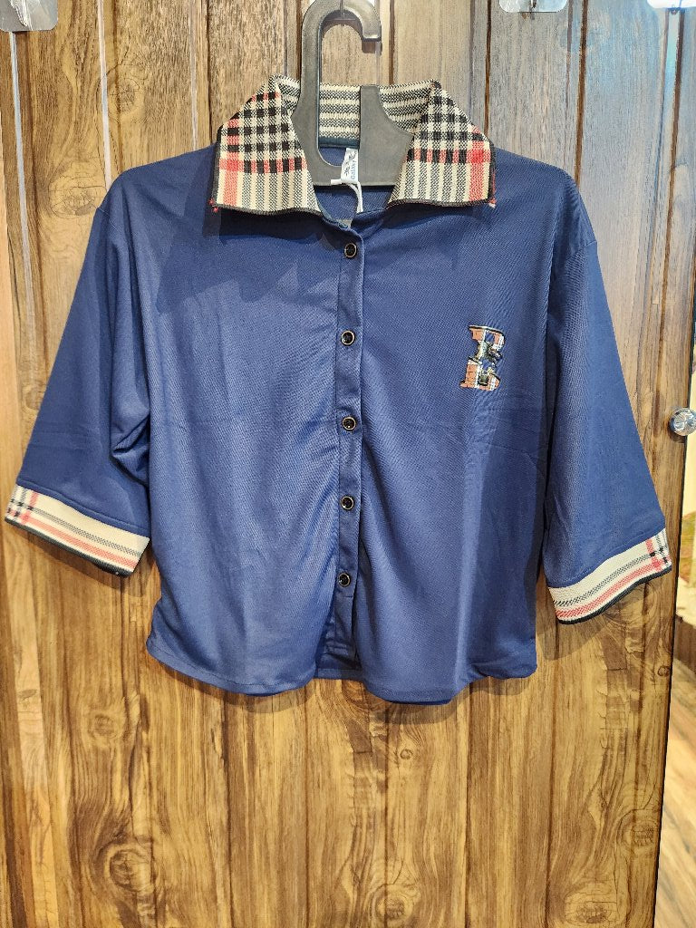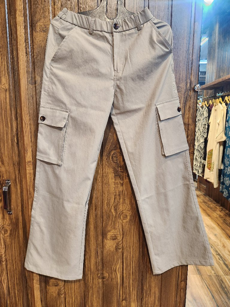 A stylish casual outfit set featuring a navy blue collared top with a checkered collar and a pair of beige cargo pants. The top has a button closure and short sleeves, perfect for a relaxed summer look. The cargo pants offer comfort and functionality with multiple pockets.