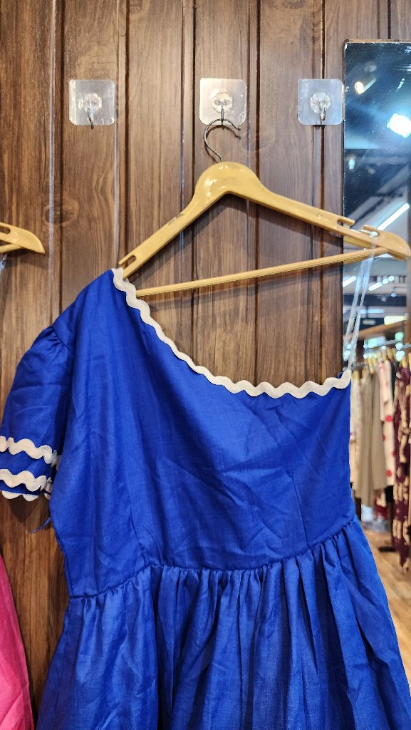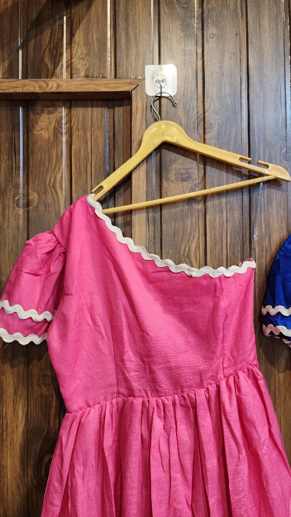A vibrant off-shoulder dress featuring a flared skirt and decorative scalloped trim. Available in two eye-catching colors: pink and blue. Perfect for casual outings or summer parties.