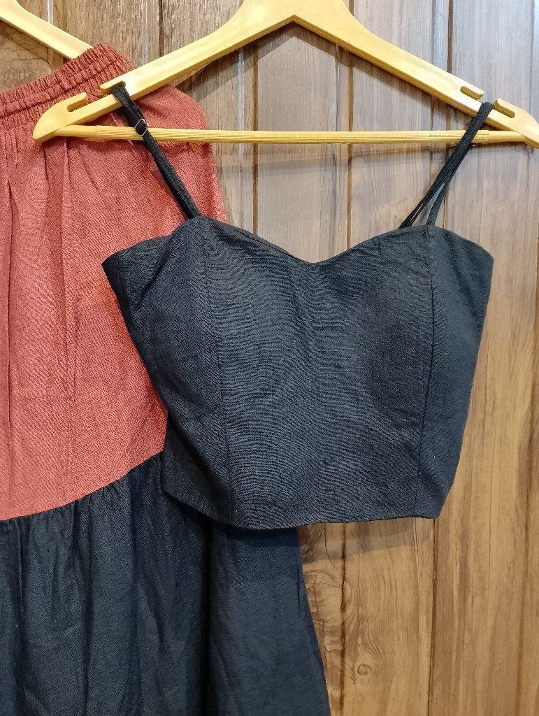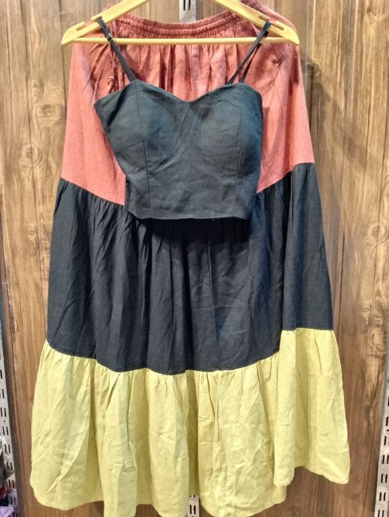 A vibrant two-piece outfit featuring a long skirt with a multi-colored design and a matching crop top. The skirt has an elastic waistband for comfort and a flowing silhouette, while the crop top features thin straps and a fitted design.