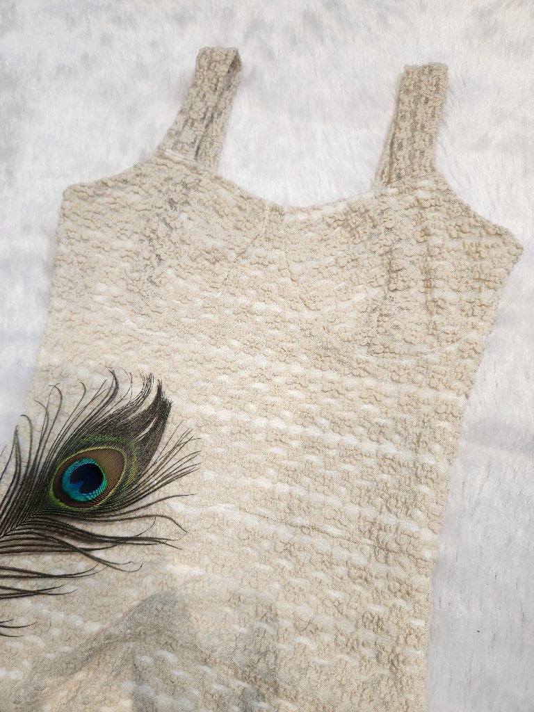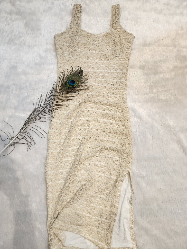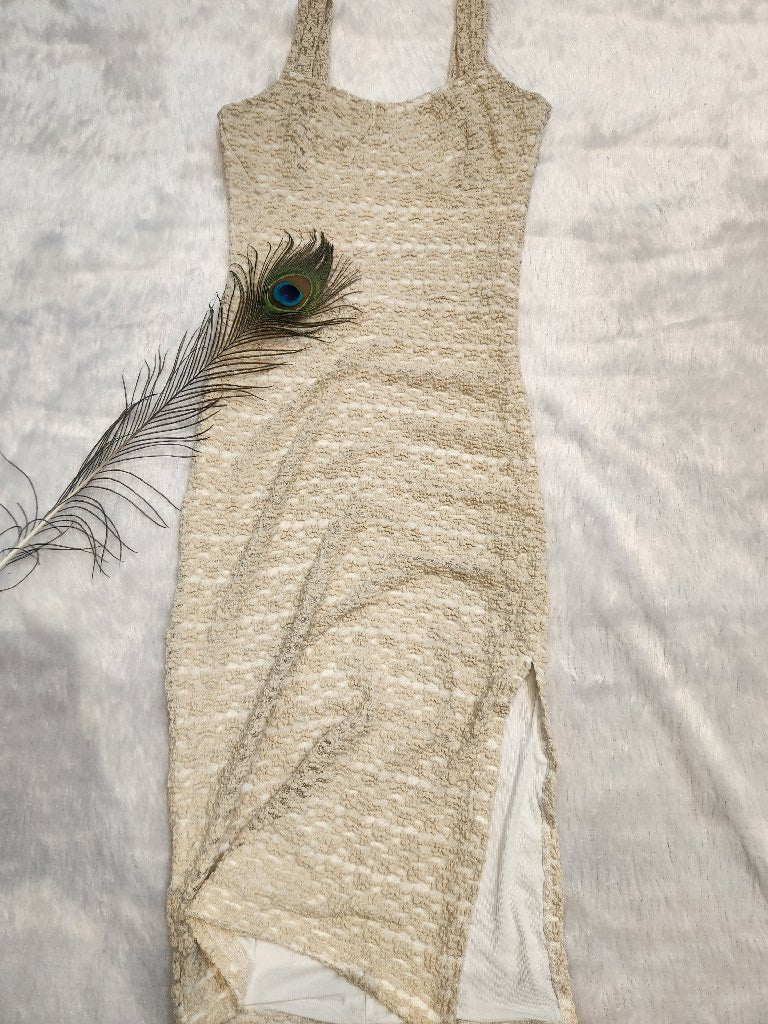 This stunning dress features a unique textured fabric that adds depth and dimension. With its elegant design and flattering silhouette, it is perfect for special occasions or a night out. The dress has a mid-length cut and is designed with thin straps for a chic look.