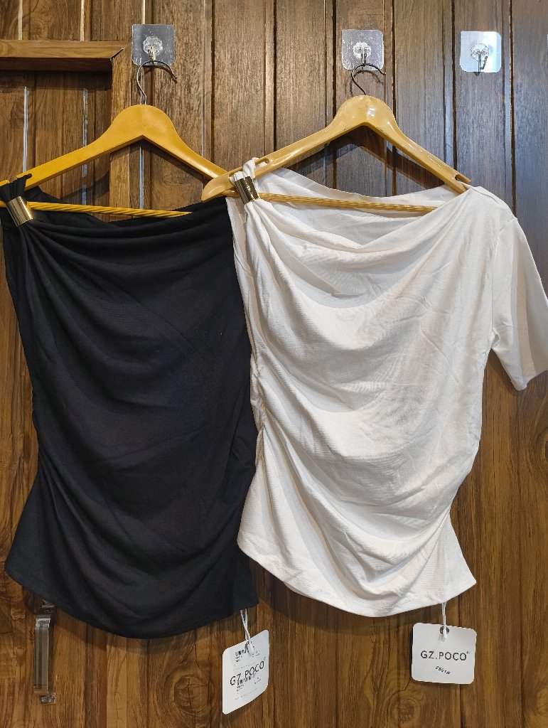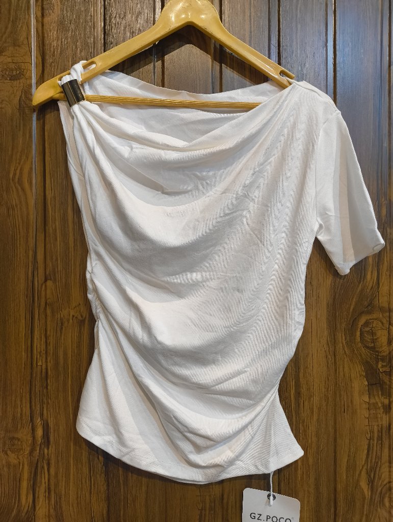 A stylish and elegant white draped top, perfect for casual outings or semi-formal occasions. The fabric is soft and lightweight, offering comfort and breathability. The draped design adds a touch of sophistication, making it a versatile addition to any wardrobe.