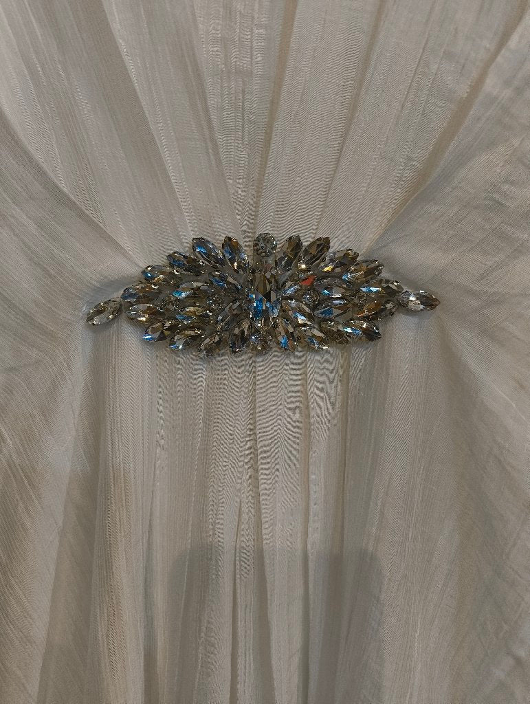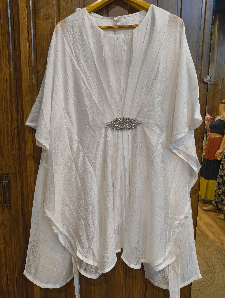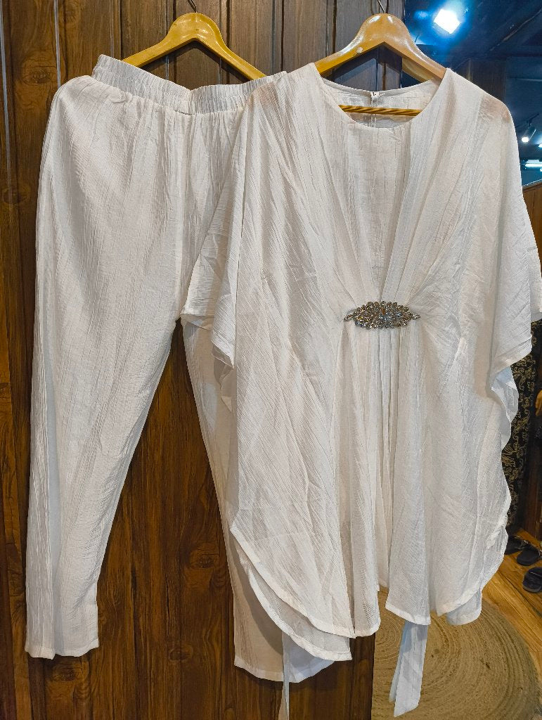 A stylish two-piece set featuring a flowing, lightweight top with a decorative brooch and comfortable elastic waist pants. Perfect for casual outings or summer events, this outfit combines elegance with ease.