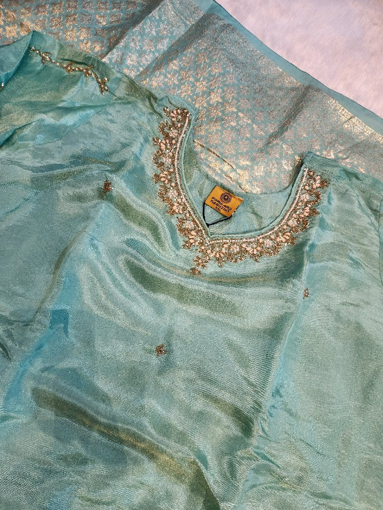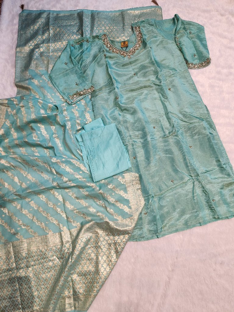 A beautiful traditional dress set featuring a stunning embellished top with intricate detailing and matching dupatta. The fabric is soft and lightweight, perfect for festive occasions.