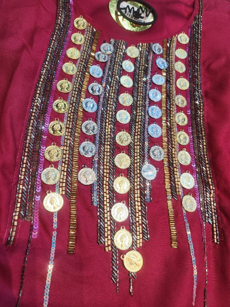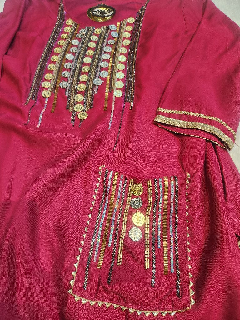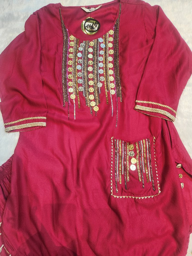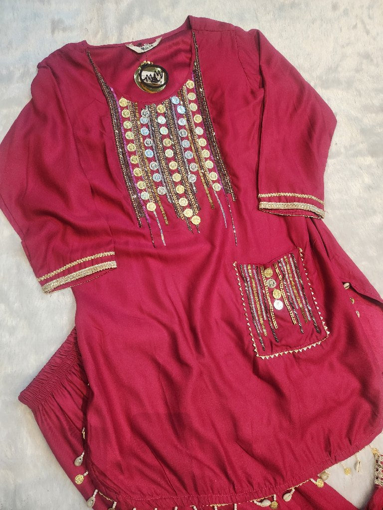 A vibrant red traditional outfit featuring intricate embellishments and a comfortable fit. The top has a high neckline and is adorned with decorative sequins and beads, while the matching pants complete the ensemble. Ideal for festive occasions.