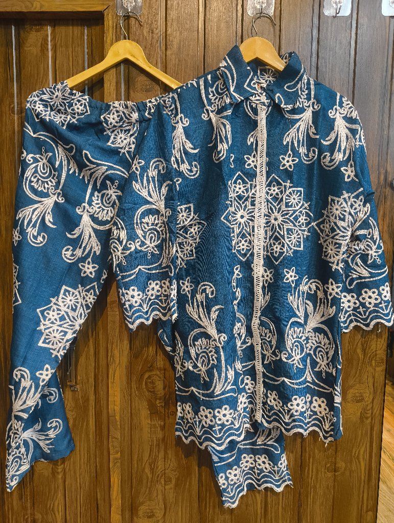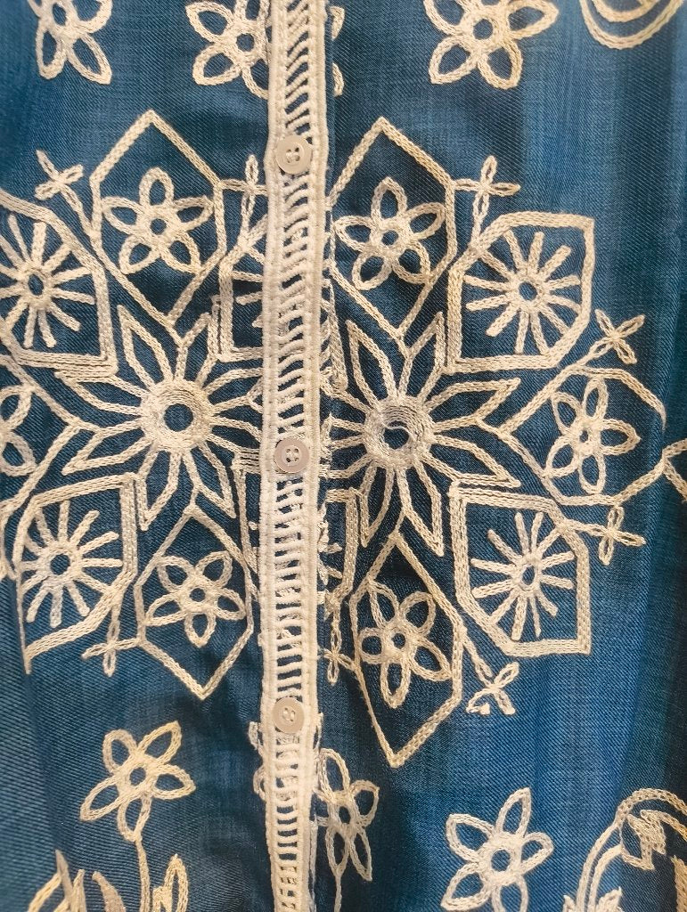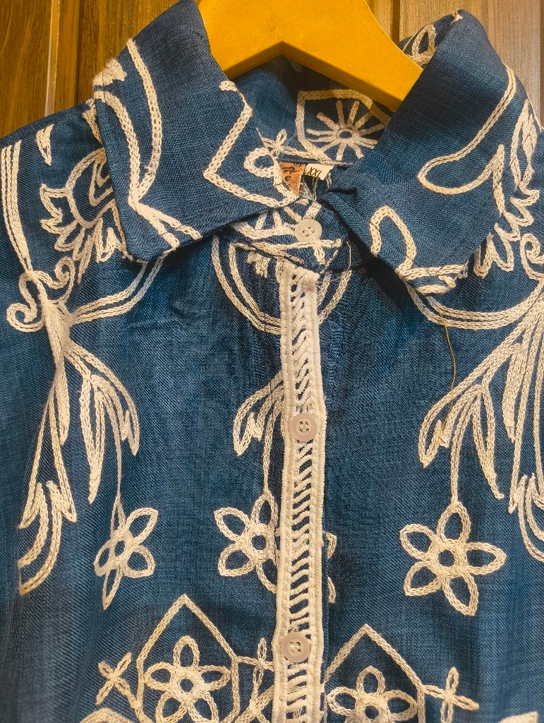 A stylish embroidered overshirt featuring intricate floral designs. Available in three vibrant colors: blue, pink, and beige. This lightweight shirt is perfect for layering or wearing alone, ideal for casual outings or summer events.
