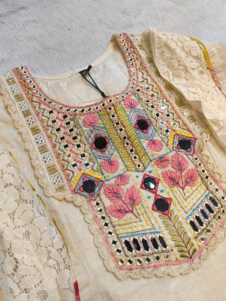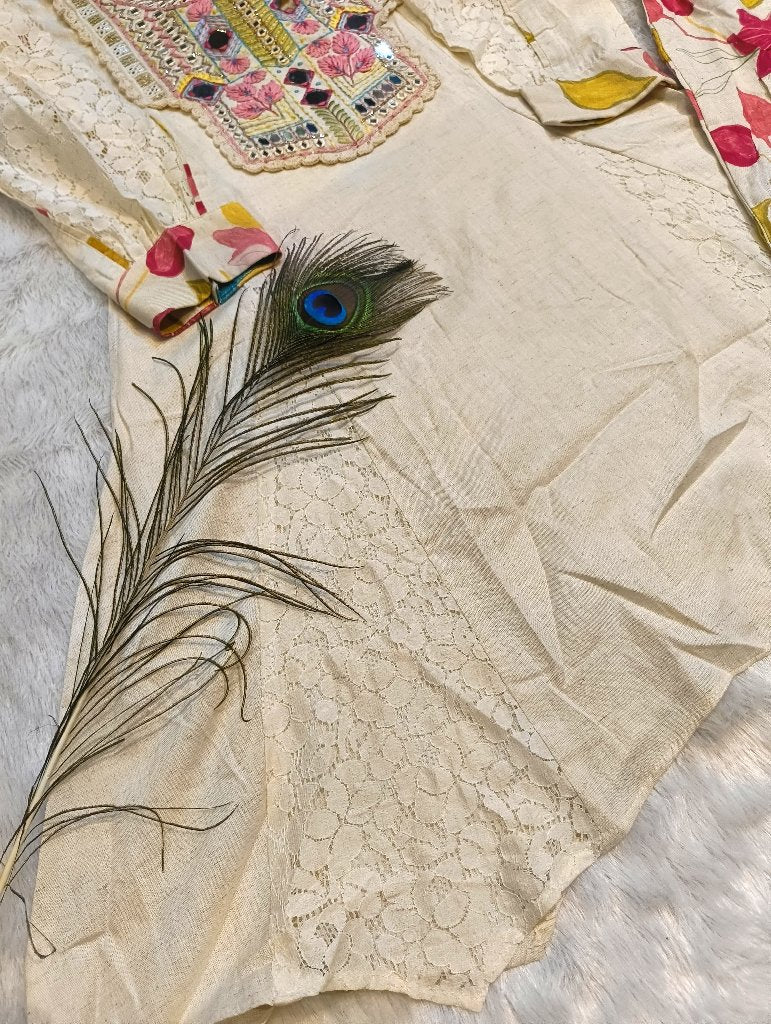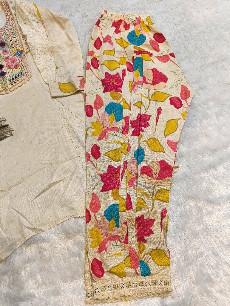 This beautiful ethnic outfit features a cream-colored kurti adorned with intricate embroidery and lace details, complemented by matching floral pants that showcase vibrant colors. The kurti has a round neckline and long sleeves, making it perfect for casual outings or festive occasions.