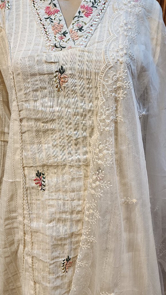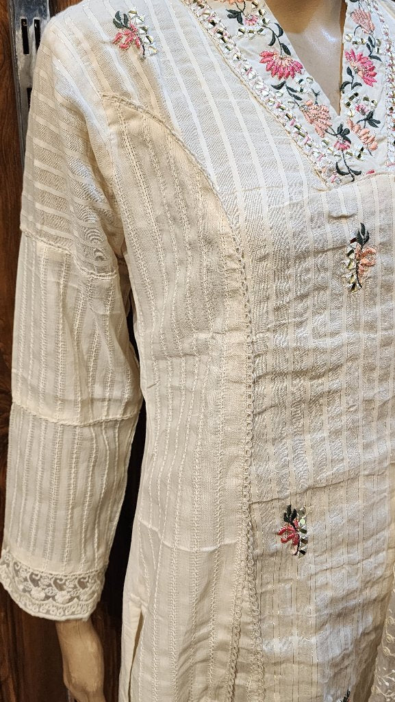 This elegant ethnic tunic features intricate embroidery and a lightweight dupatta, perfect for festive occasions. The tunic has a high neckline and long sleeves, crafted from breathable fabric for comfort. The delicate floral patterns add a touch of femininity, making it suitable for both casual and semi-formal events.