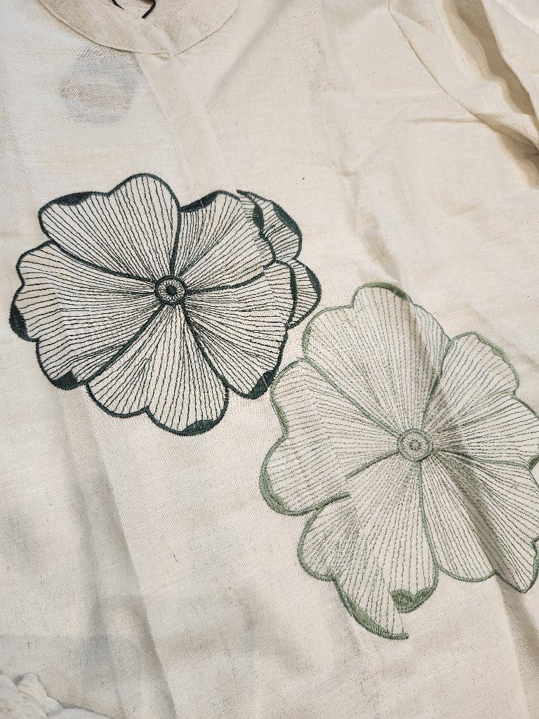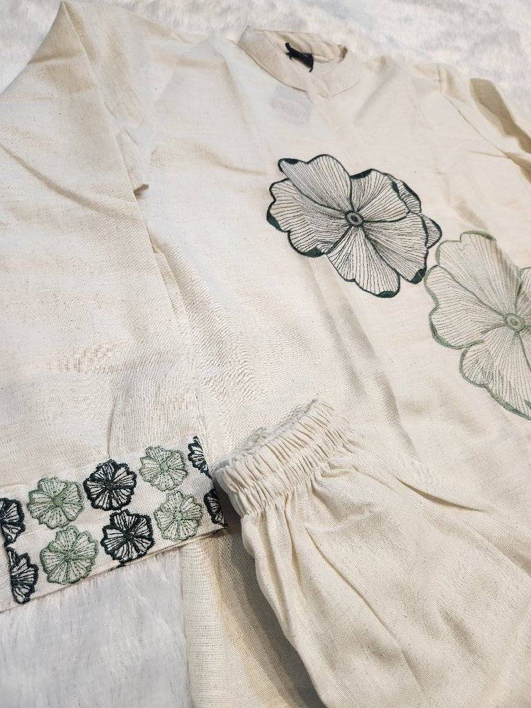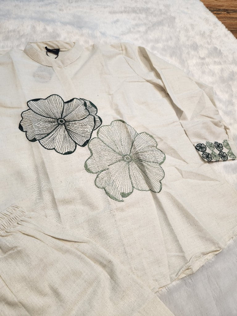 A stylish and comfortable kurta set featuring intricate floral embroidery. The kurta has a high neck and long sleeves, complemented by matching pants. Ideal for casual outings or festive occasions.