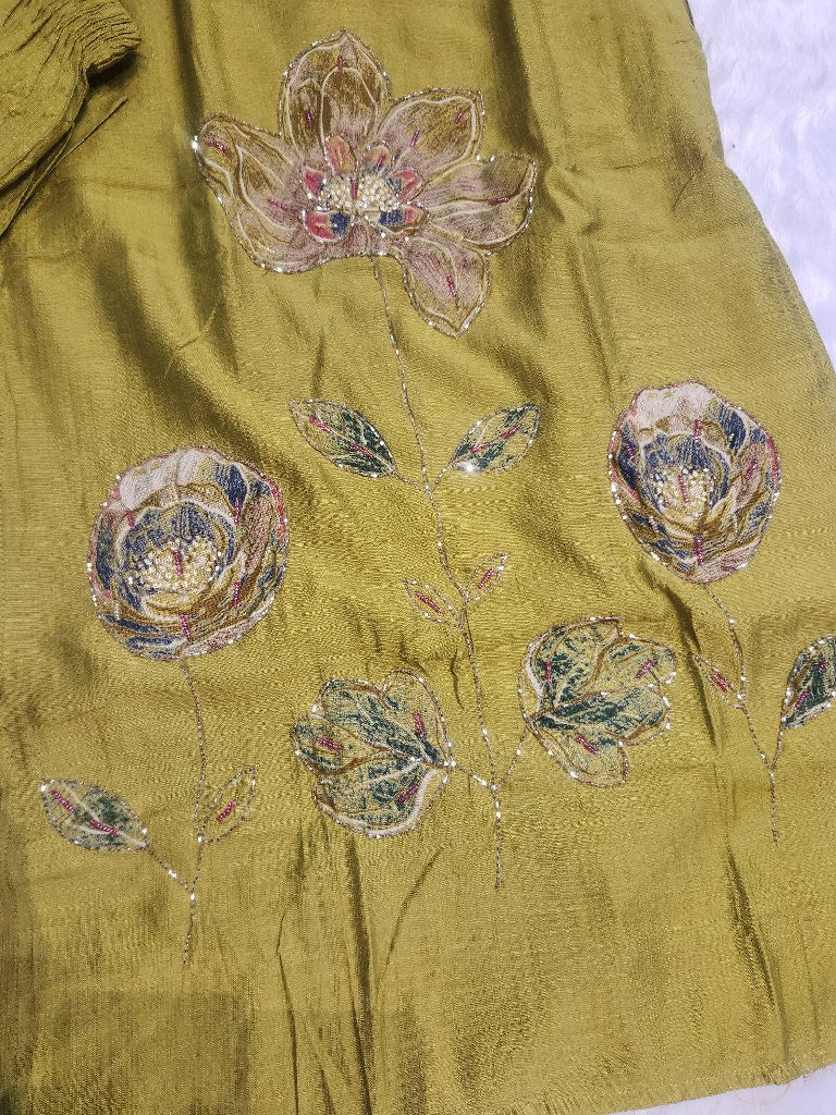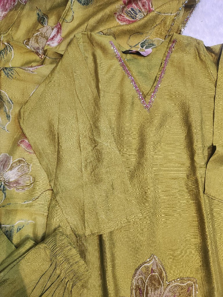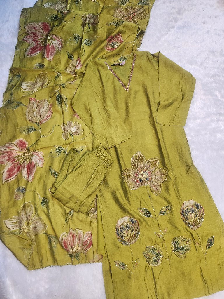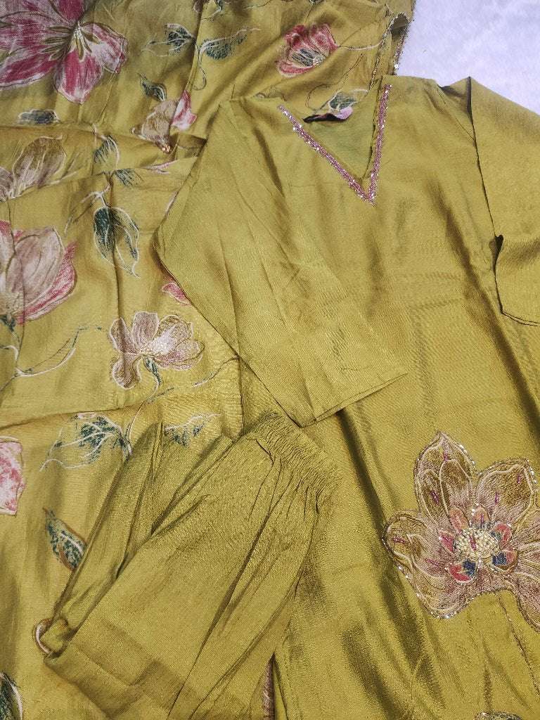 This elegant kurta set features intricate floral embroidery on a soft fabric, complemented by a matching dupatta. The kurta has a relaxed fit with three-quarter sleeves and a stylish neckline, making it perfect for festive occasions or casual outings.