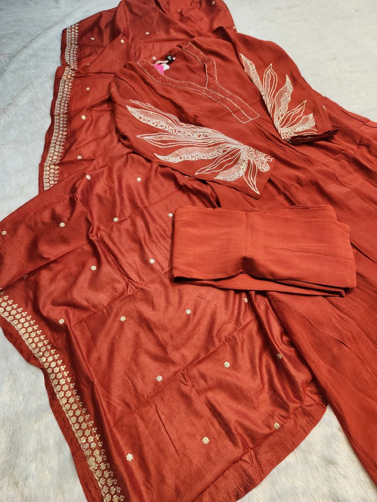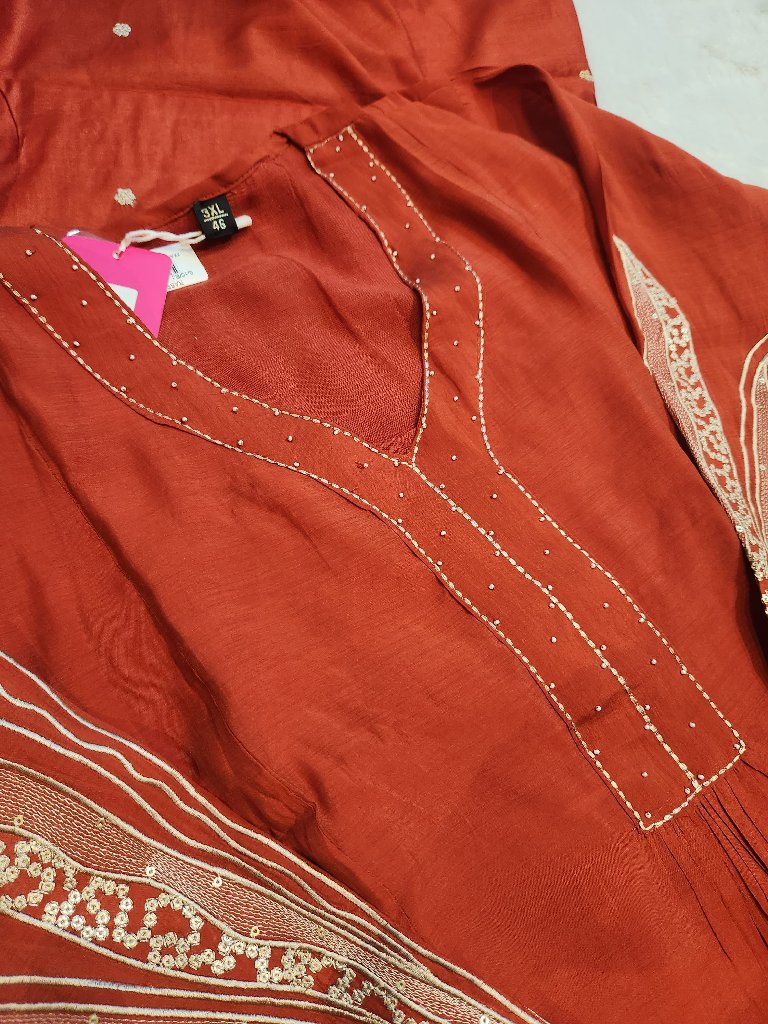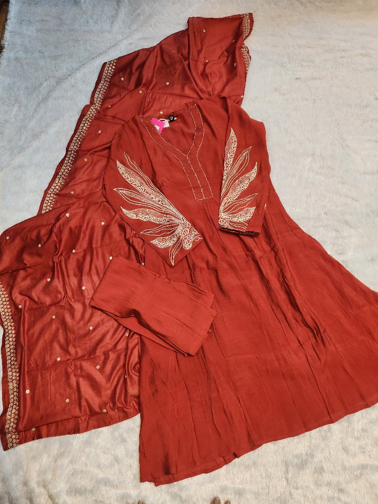 A beautiful embroidered kurta in a rich rust color, featuring intricate designs on the sleeves and a matching dupatta. The kurta has a relaxed fit, making it perfect for casual or festive occasions. The fabric is lightweight and comfortable, ideal for warm weather.