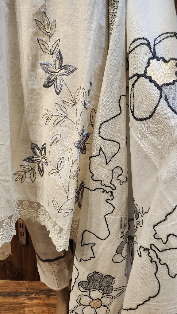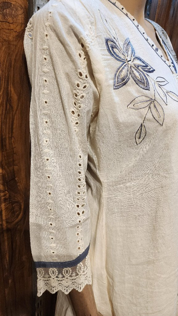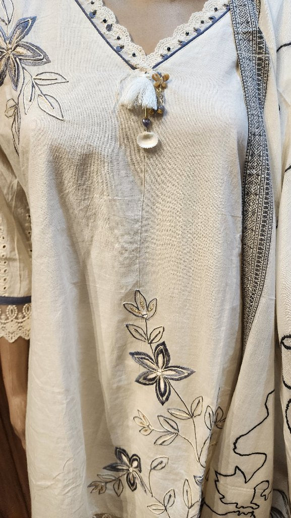 A stylish and elegant embroidered kurta paired with a matching dupatta. The kurta features intricate floral designs and lace detailing, perfect for festive occasions or casual wear. The lightweight fabric ensures comfort, making it ideal for warm weather.