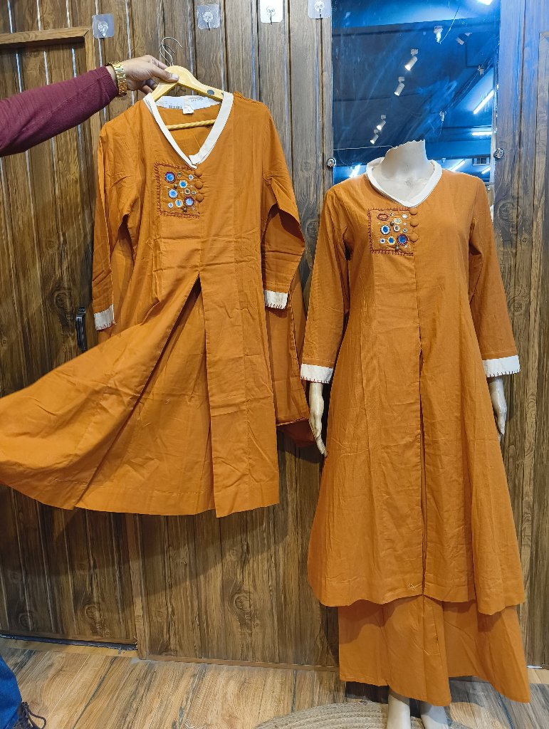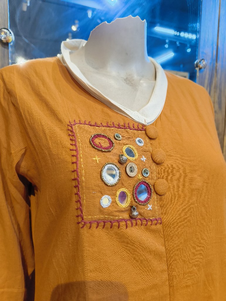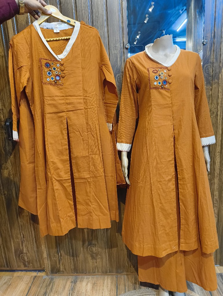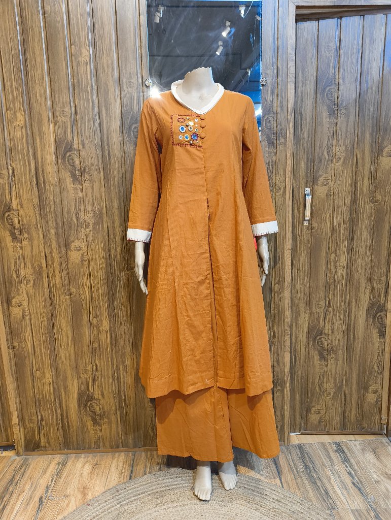 A stylish long kurta featuring intricate embroidery on the chest area, designed for comfort and elegance. The kurta has a high neckline and is made from lightweight fabric, making it perfect for casual outings or festive occasions.