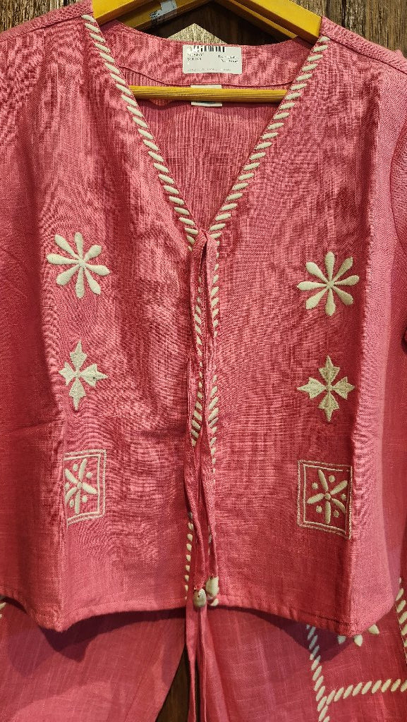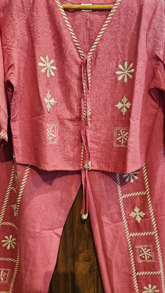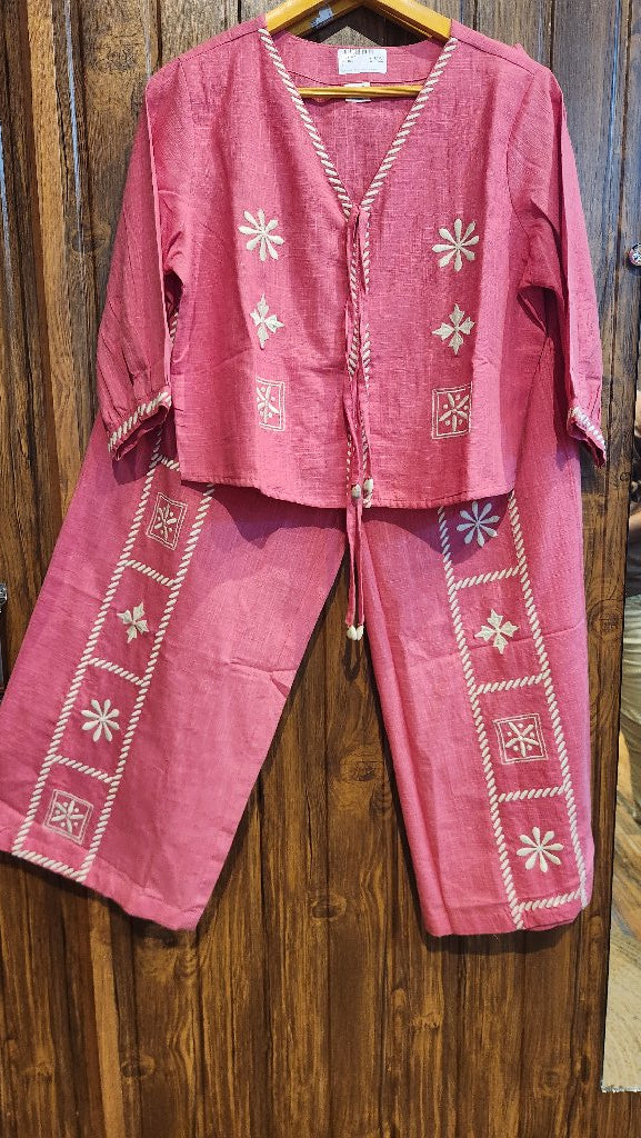 A stylish two-piece set featuring a cropped top with intricate embroidery and matching wide-leg pants. The set is designed for comfort and elegance, perfect for casual outings or relaxed gatherings.