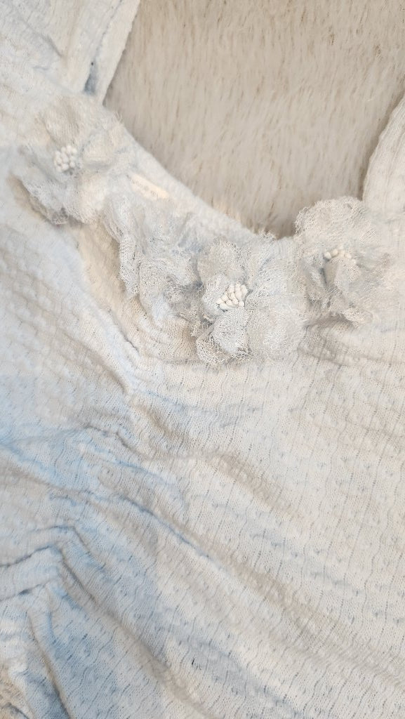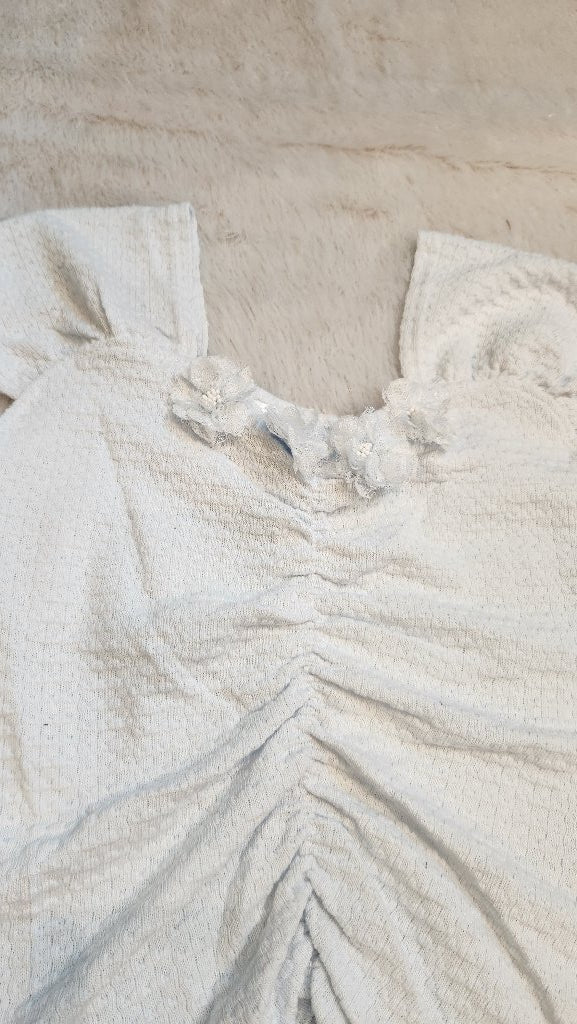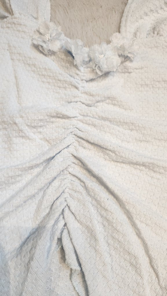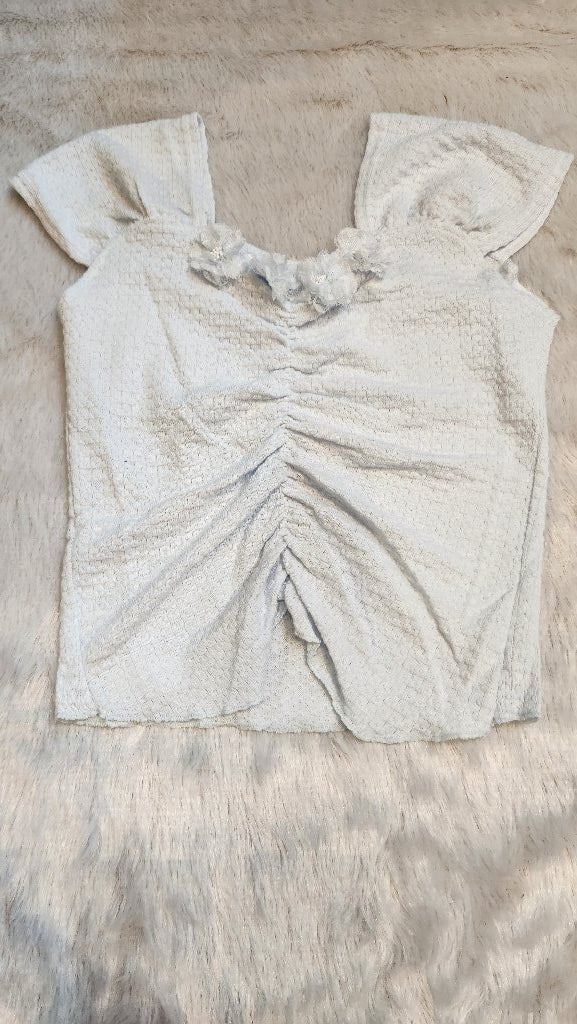 A stylish women's top featuring a textured fabric with floral embellishments at the neckline. The top has a unique ruched design that adds a touch of elegance, making it perfect for casual outings or events.