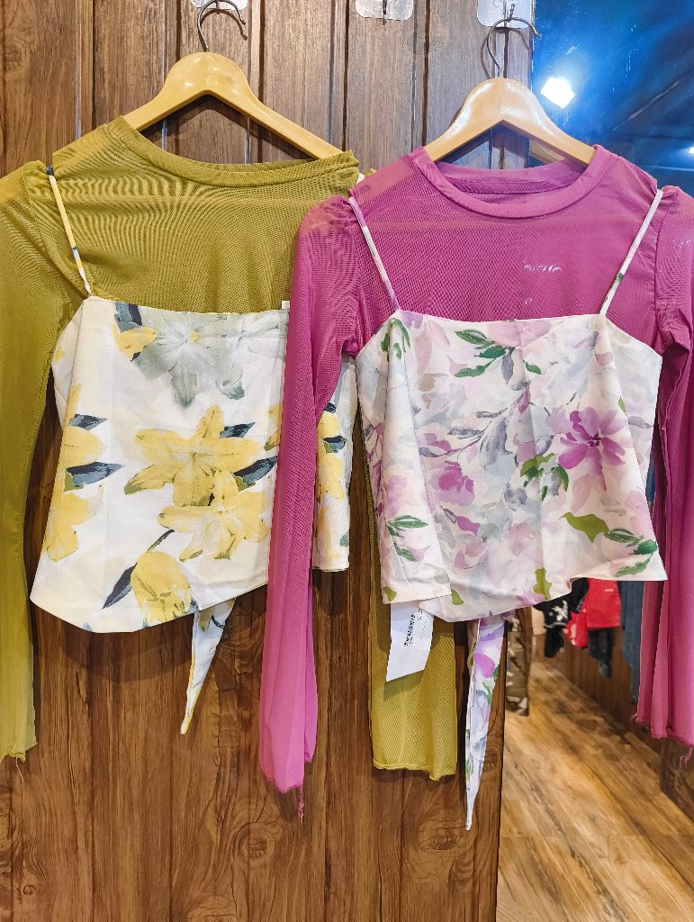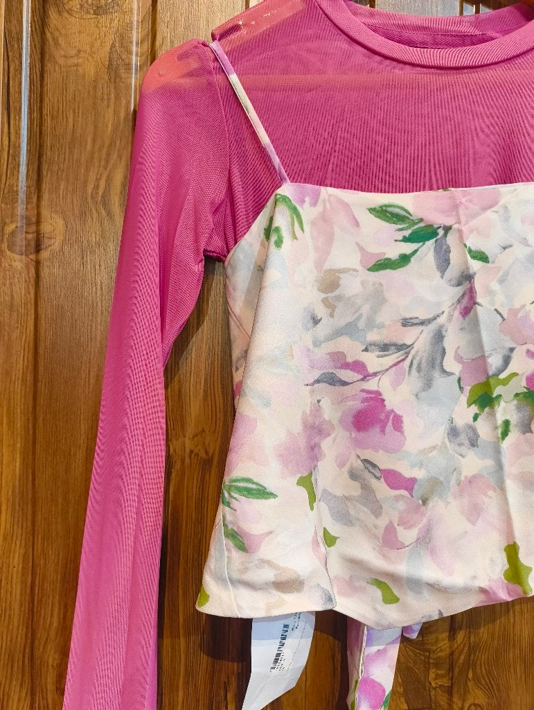 A stylish floral layered top featuring a combination of vibrant colors and textures. The top has a high neck design with a floral print overlay and a solid color base. Perfect for casual outings or summer events.