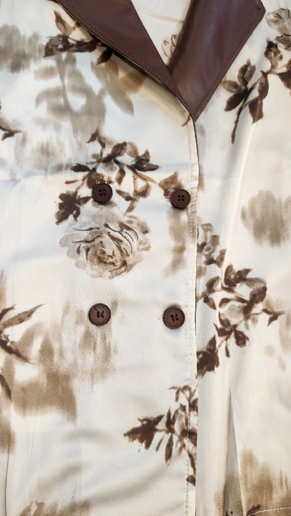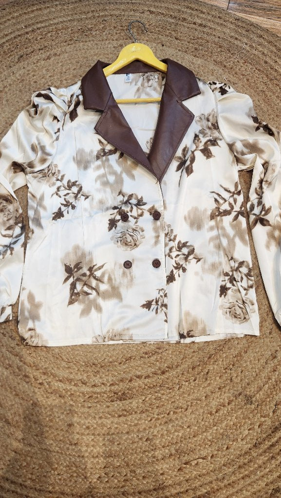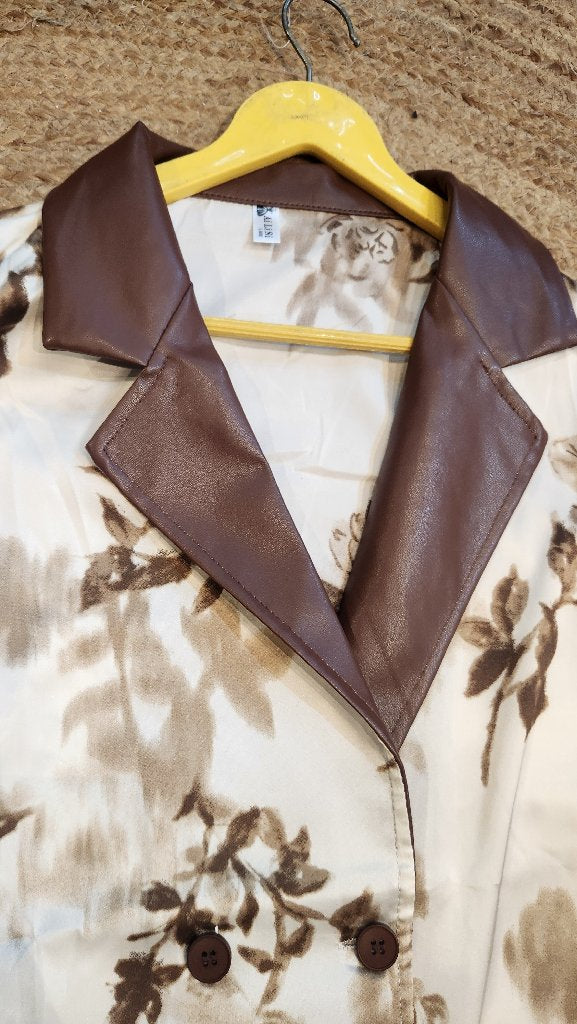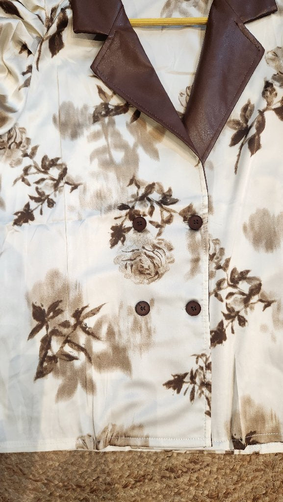 A stylish floral print blazer featuring a unique brown leather collar and button closure. The blazer has puffed sleeves and a lightweight fabric, making it perfect for layering in transitional weather. The floral design adds a touch of elegance, suitable for both casual and semi-formal occasions.