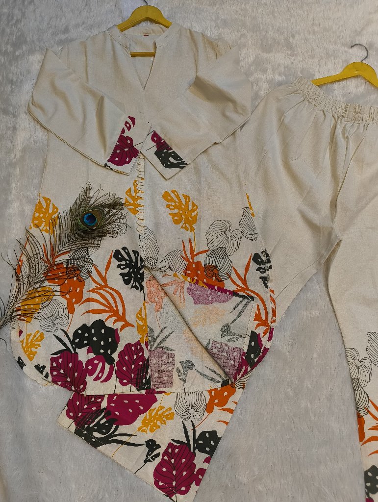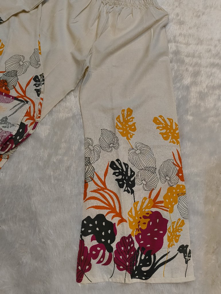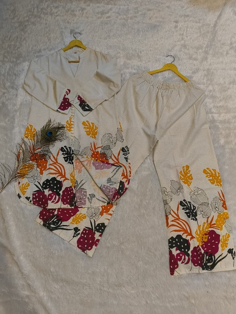 A stylish traditional outfit featuring a floral print design with vibrant colors. The top has a high neck and long sleeves, while the pants are designed for comfort with an elastic waistband. Perfect for casual wear or festive occasions.