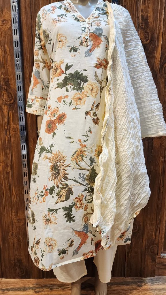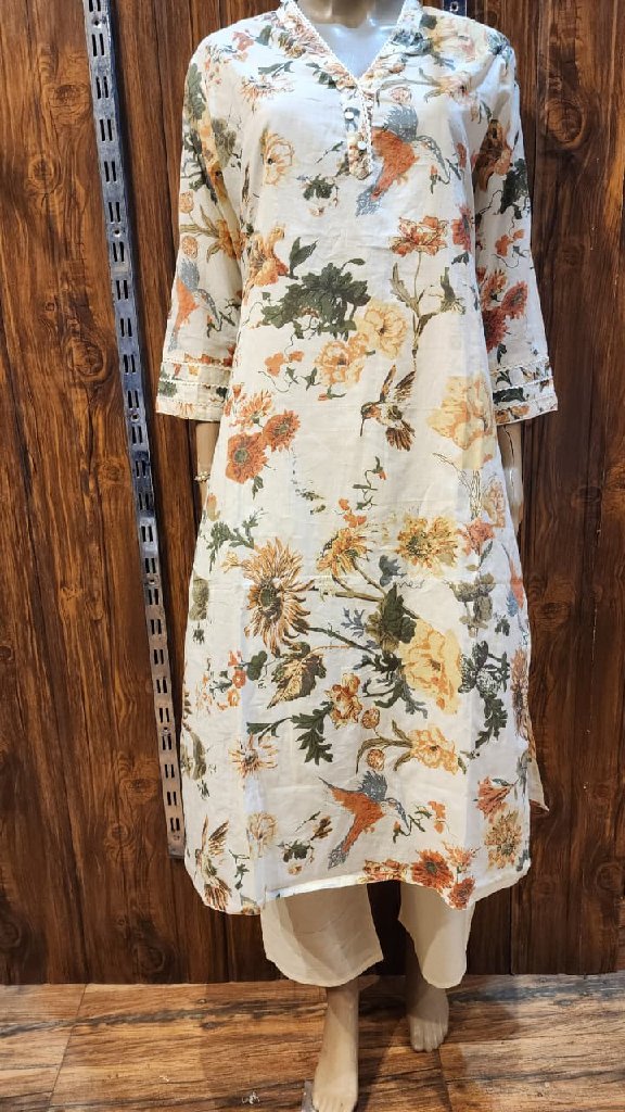 A beautiful floral printed kurta featuring a V-neckline and button detailing, paired with a lightweight dupatta. The kurta is designed with vibrant floral patterns in shades of orange and green on a soft beige background, making it perfect for casual outings or festive occasions.
