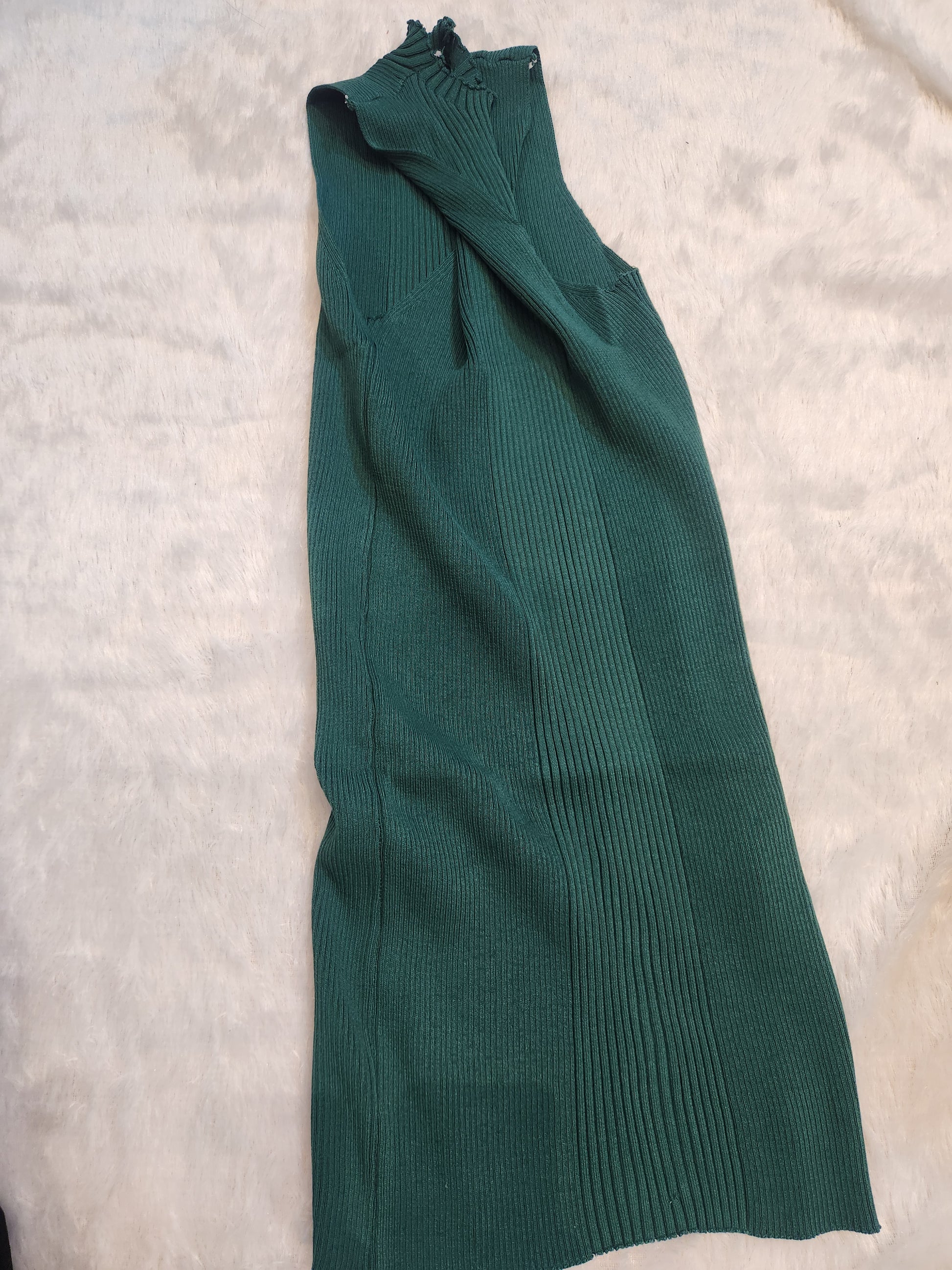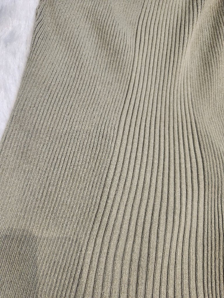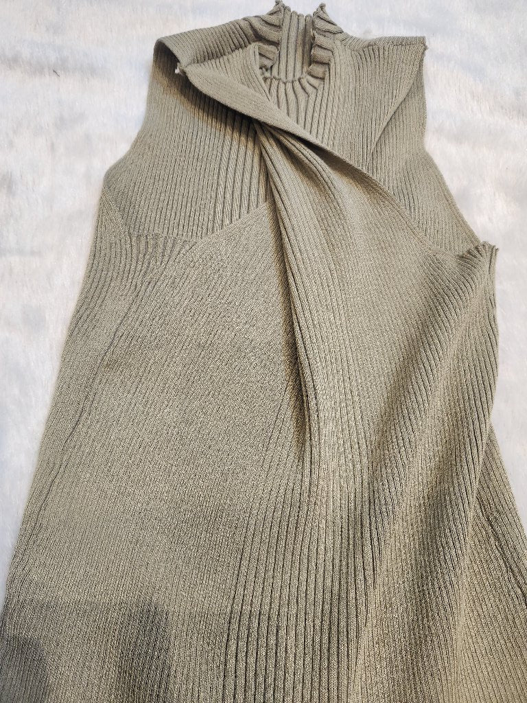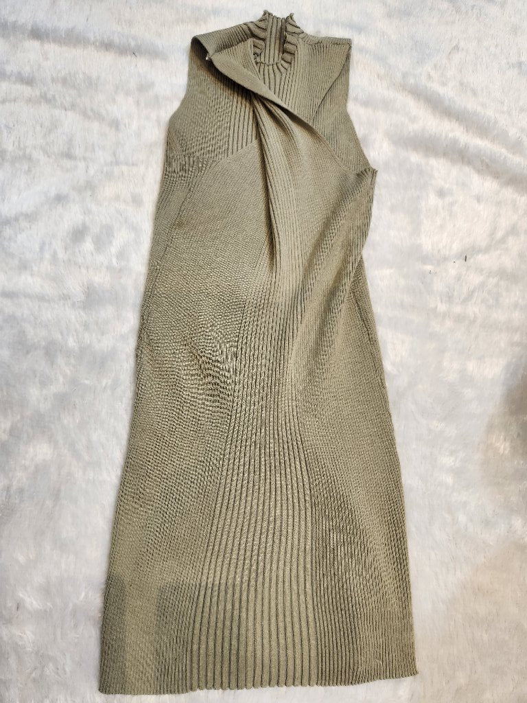 A stylish and elegant knit midi dress featuring a unique ribbed texture and a high neck design. The dress is designed to provide a flattering silhouette, perfect for casual outings or semi-formal events.