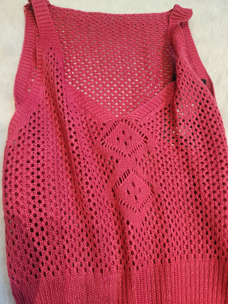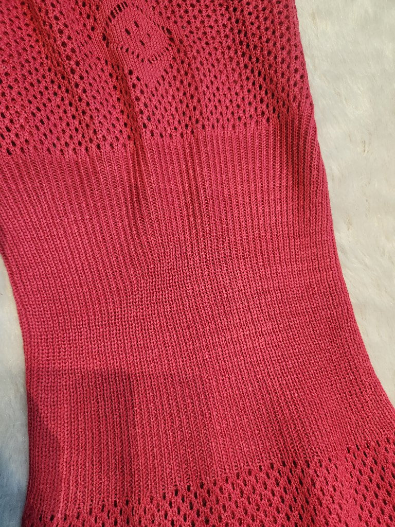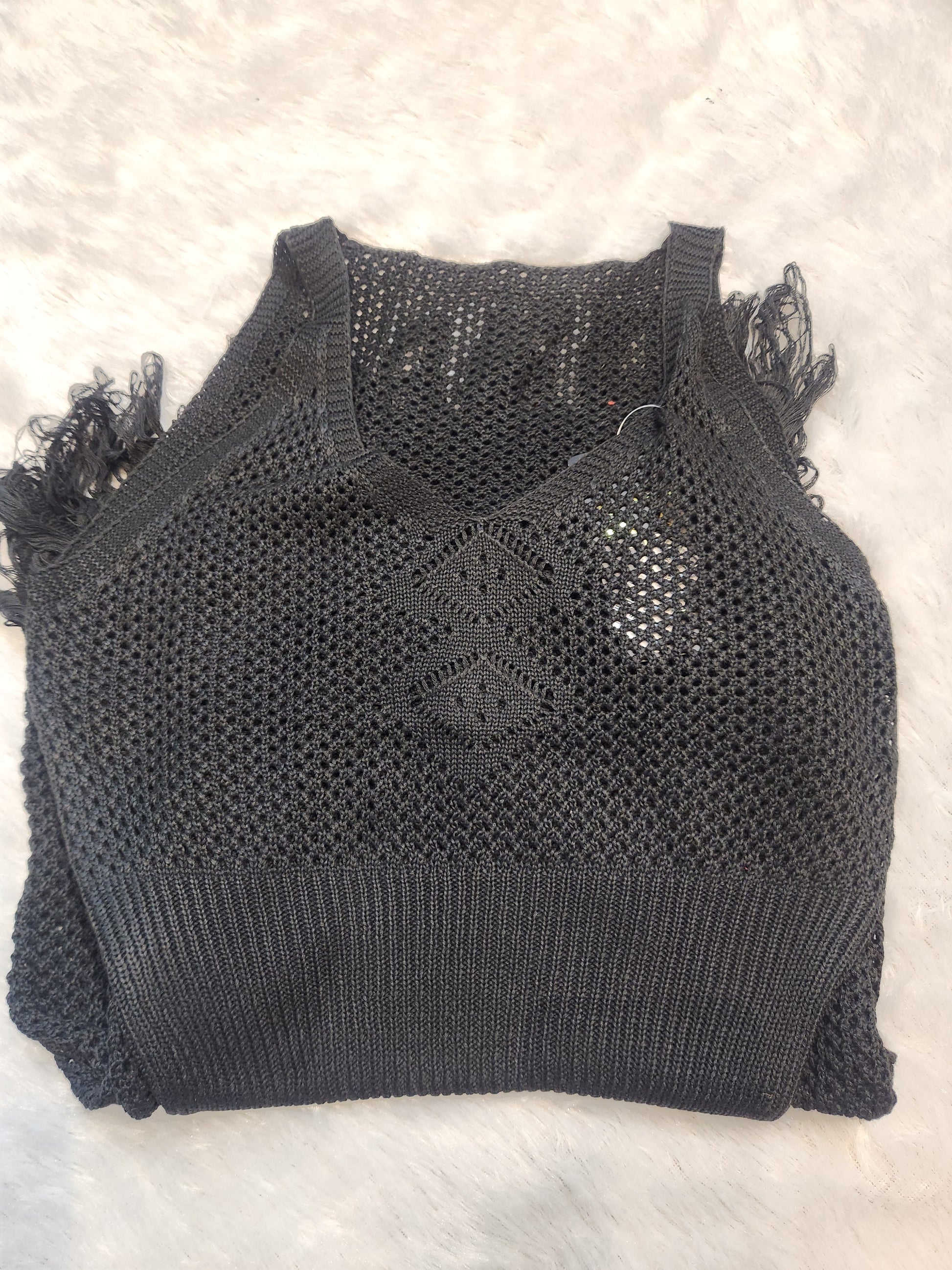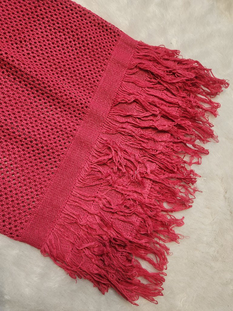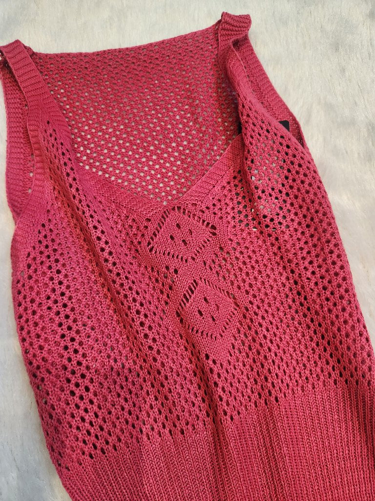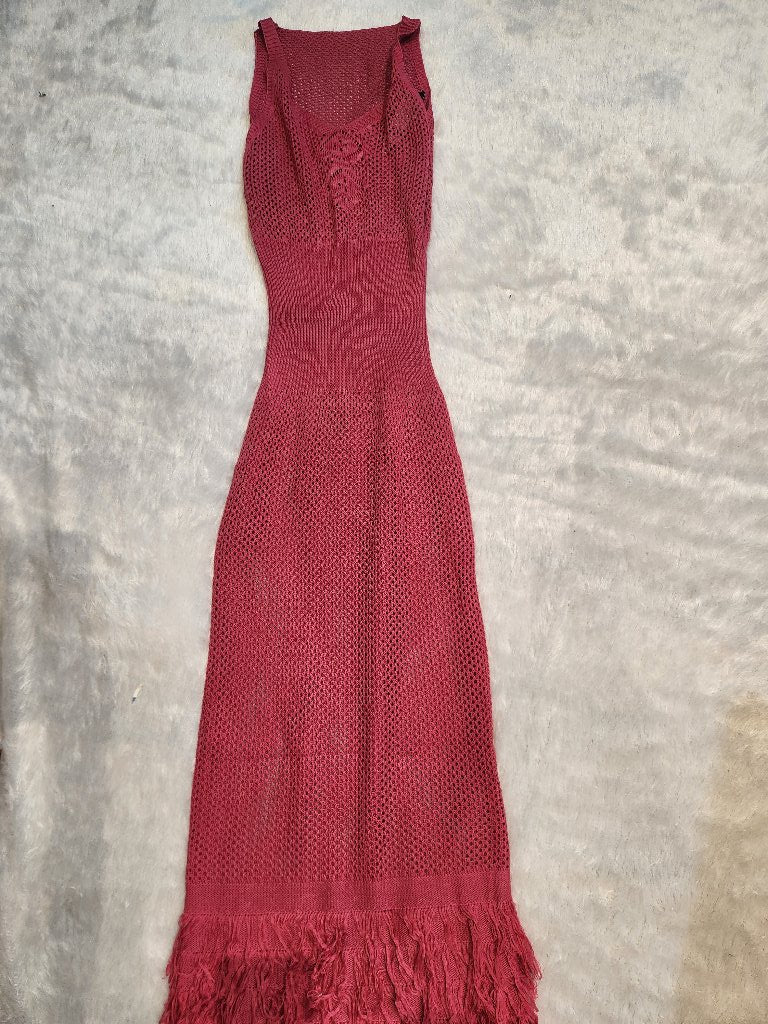 A stylish knitted maxi dress featuring a unique design with a high neckline and fringe detailing at the hem. This dress is perfect for summer outings, providing both comfort and a trendy look.