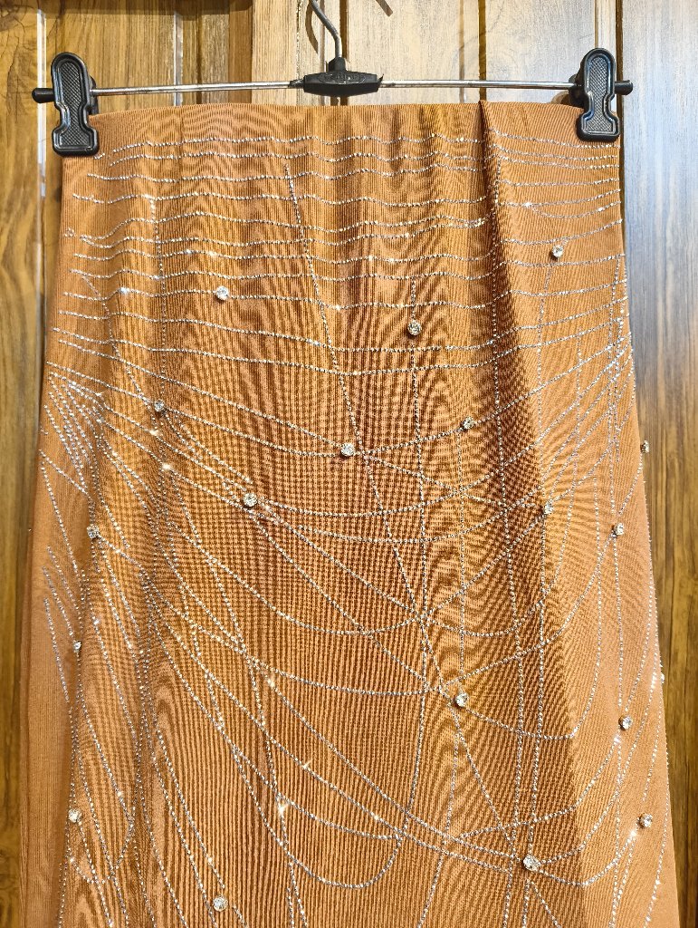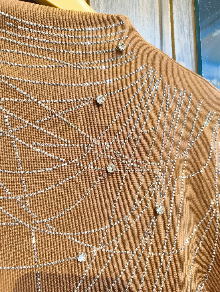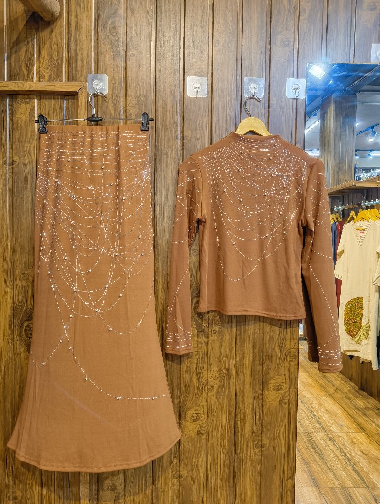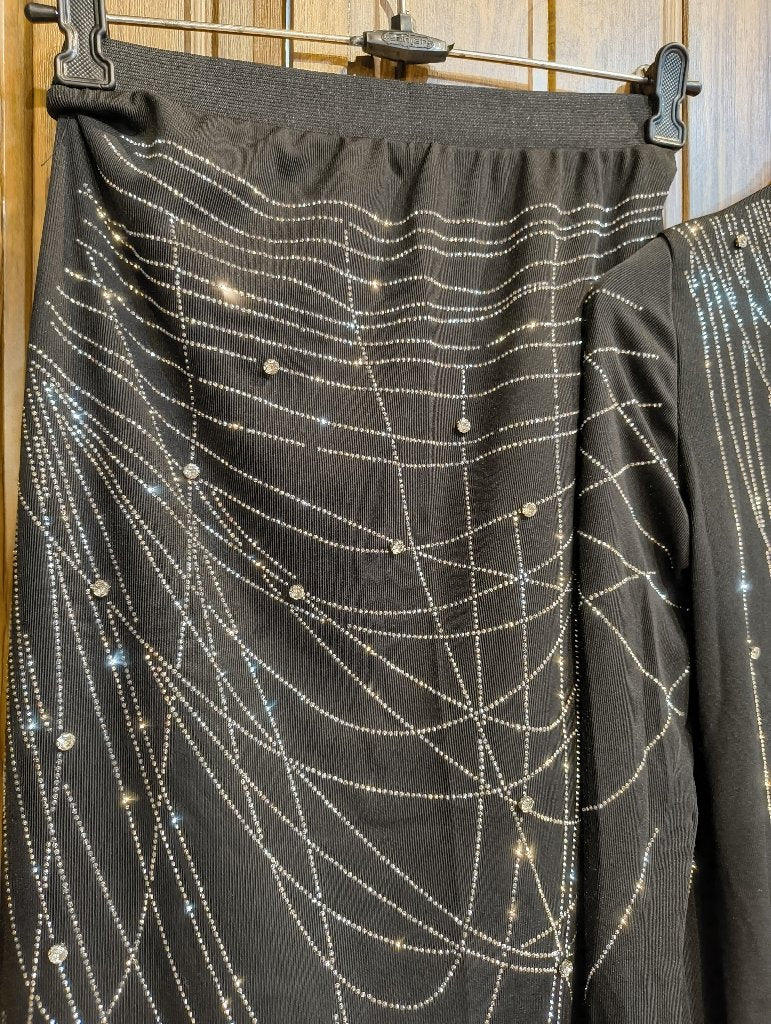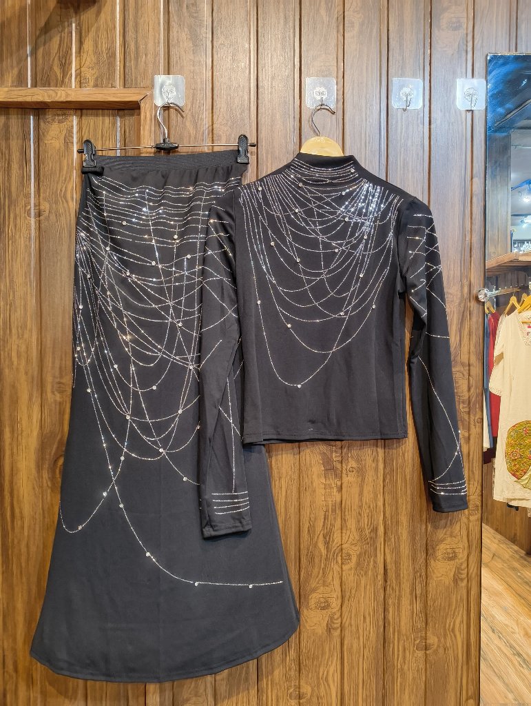 A stylish black set featuring a long sleeve top adorned with intricate silver detailing and a matching skirt. The top has a high neck design and a fitted silhouette, while the skirt offers a flattering fit that complements the overall look. Perfect for casual outings or semi-formal events.