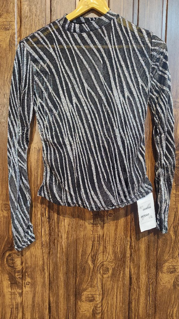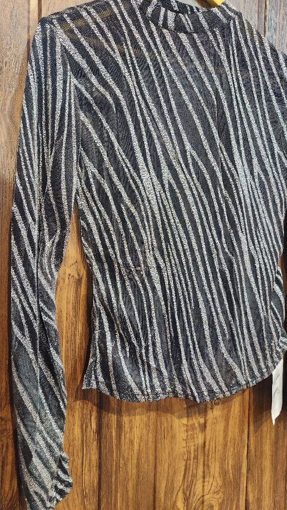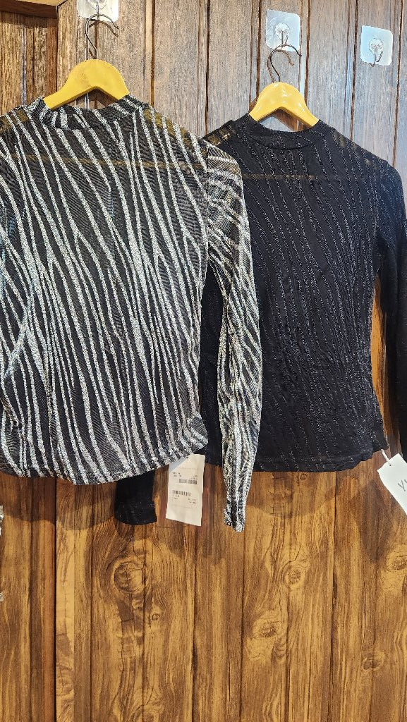 A stylish long sleeve top featuring a high neck design, available in two distinct patterns: a black and white striped design and a solid black. Perfect for layering or wearing alone, this top combines comfort with a chic look.