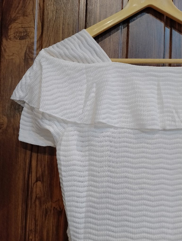 A stylish off-shoulder top featuring a ruffled neckline and a textured fabric. Perfect for summer outings, this top combines comfort with a chic look.