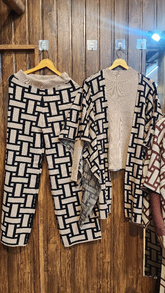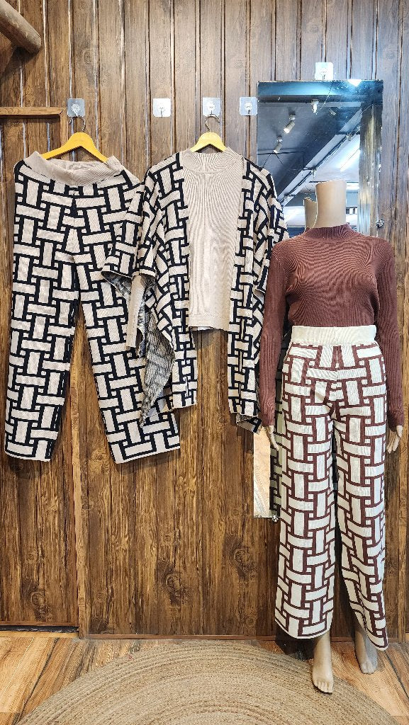 A stylish ensemble featuring a patterned open cardigan, a ribbed long-sleeve top, and wide-leg patterned trousers. The outfit combines comfort with a chic design, perfect for casual outings.