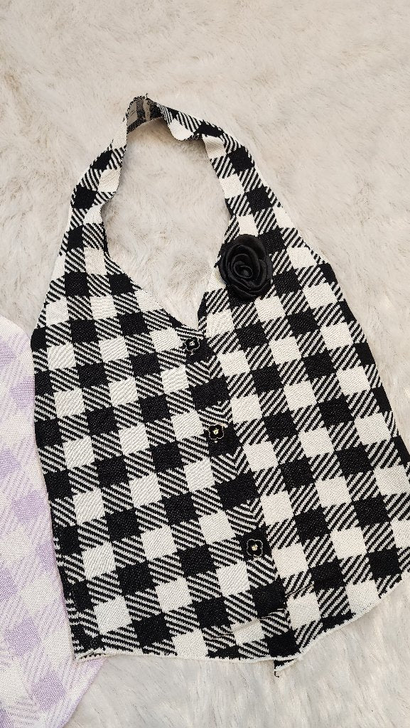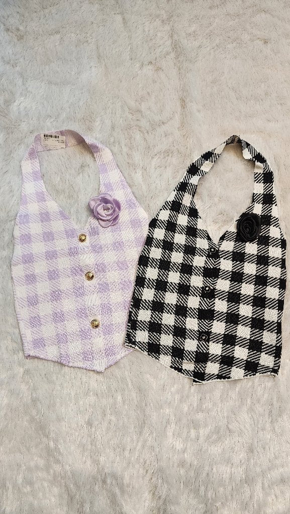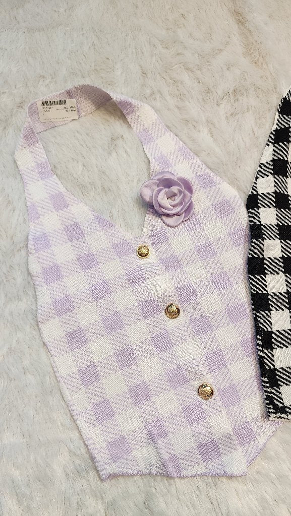 A stylish halter top featuring a unique plaid design in lavender and black. The top has decorative buttons and a floral accent, making it perfect for casual summer outings. The halter style provides a flattering neckline, ideal for warm weather.