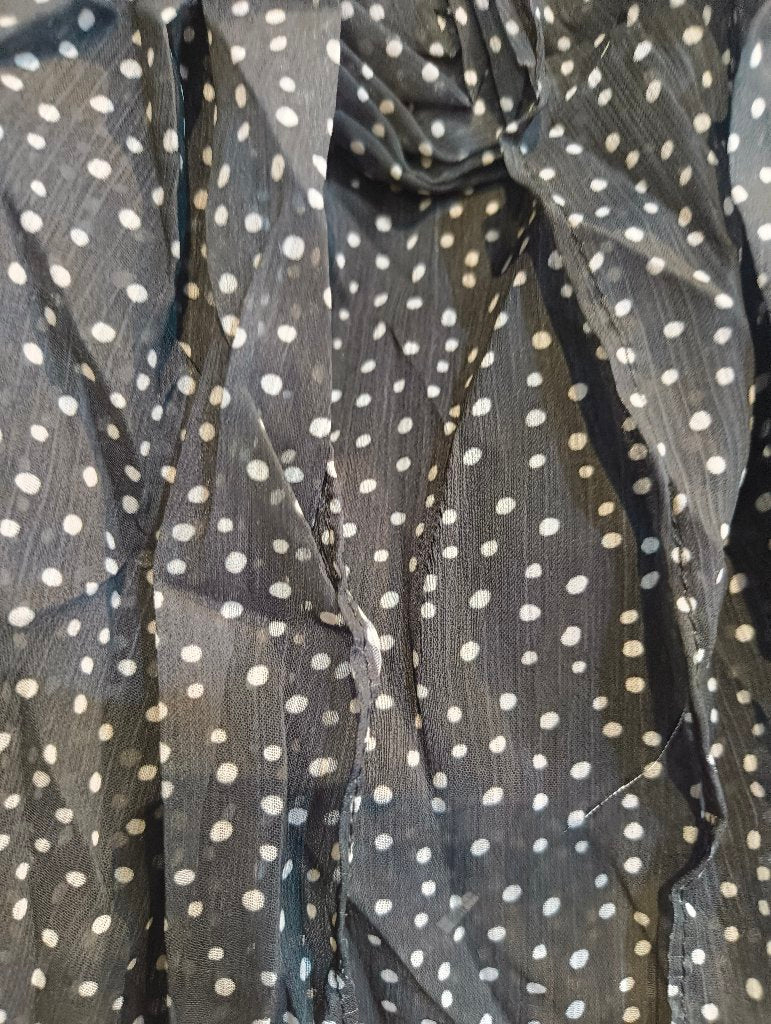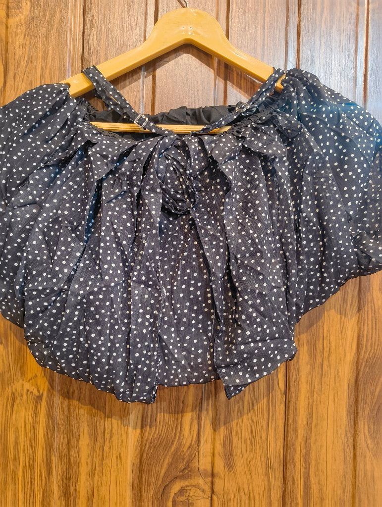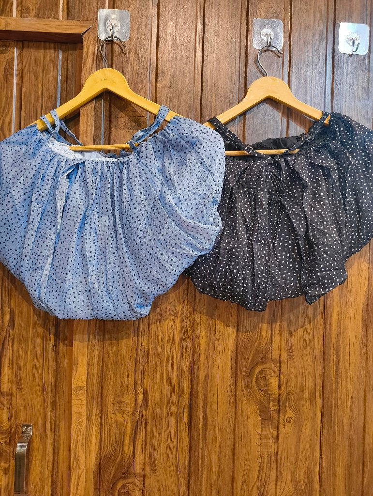 A pair of playful tulle skirts featuring a polka dot pattern, available in light blue and black. These skirts are designed with an elastic waistband for comfort and a flared silhouette that adds a whimsical touch to any outfit.
