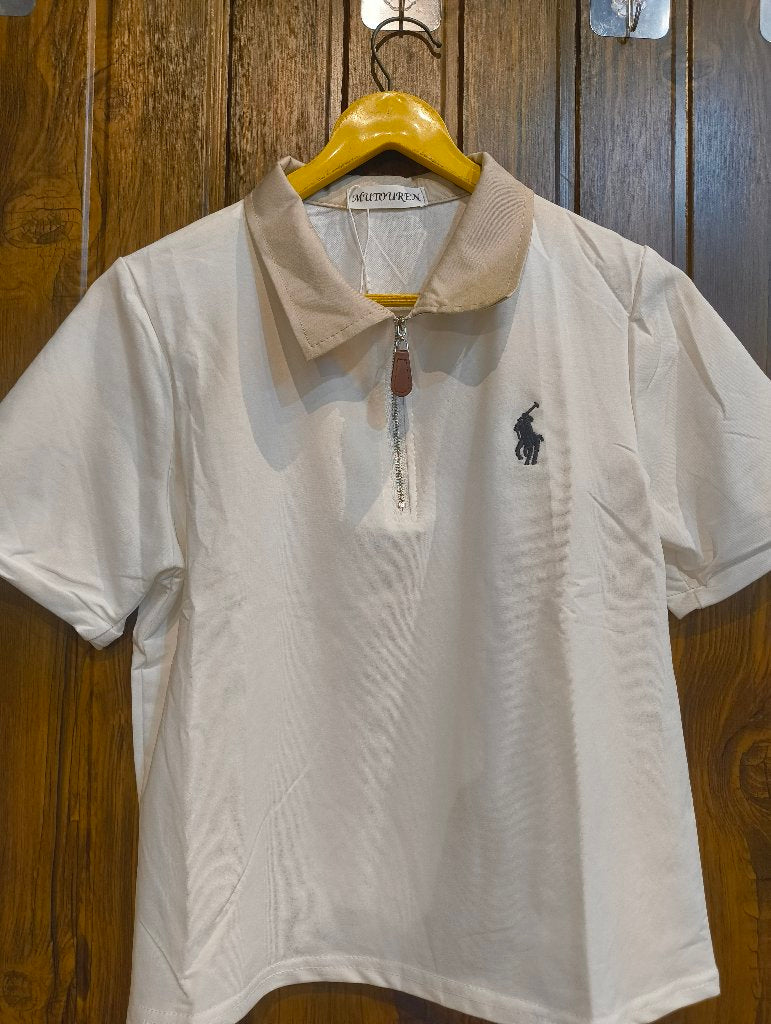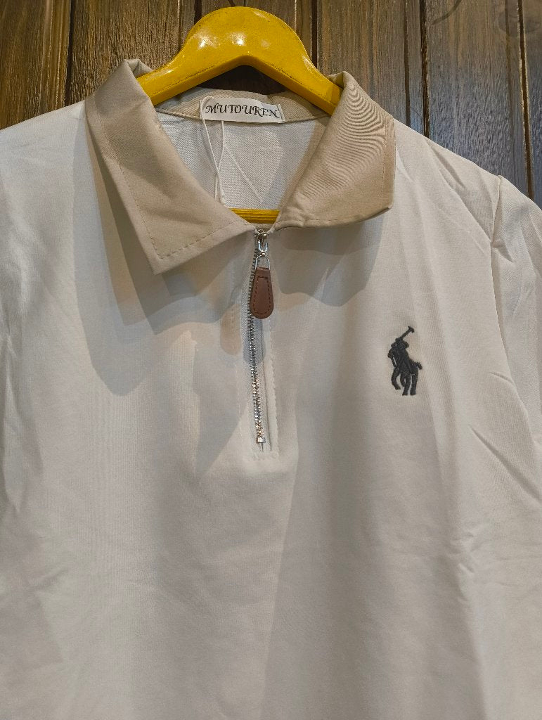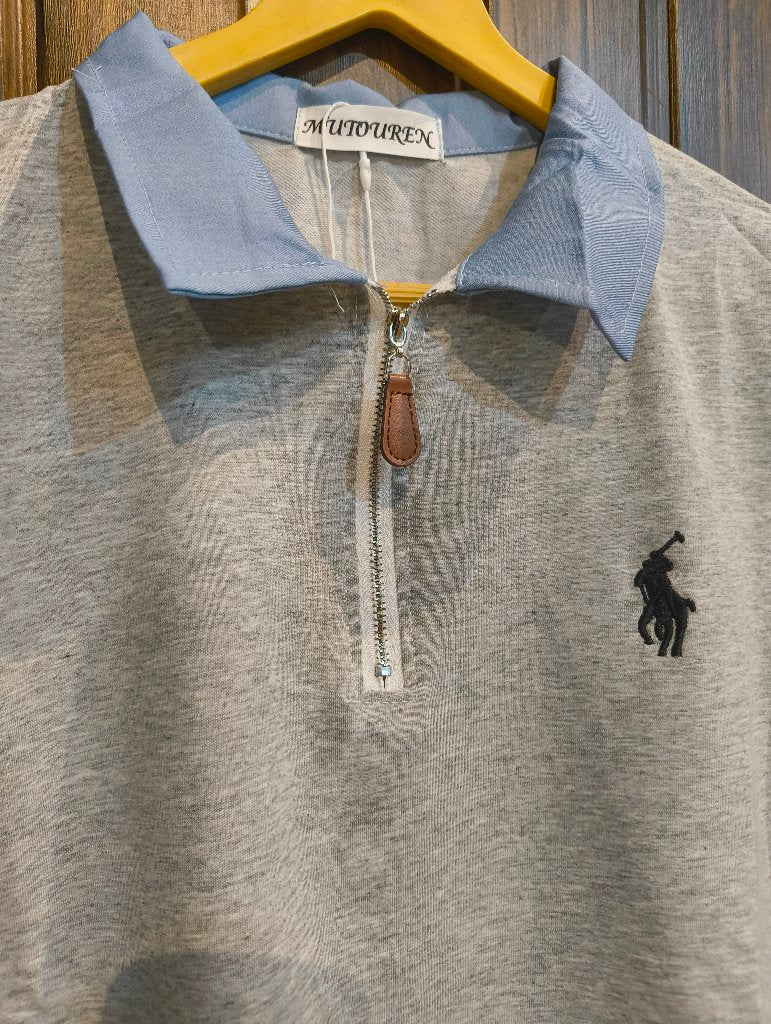 A stylish polo shirt featuring a zippered collar and a classic fit. Available in two color options: grey with a light blue collar and white with a beige collar. Perfect for casual outings or relaxed office wear.