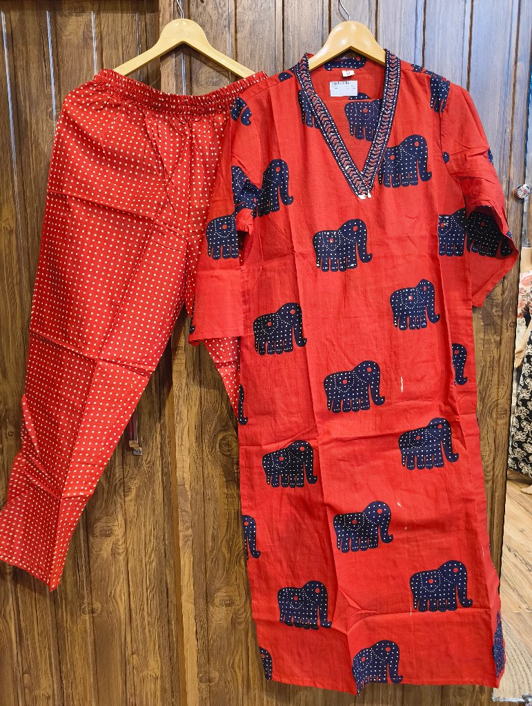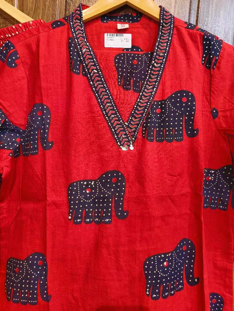 A vibrant red kurta adorned with a unique elephant print, complemented by matching polka dot pants. The kurta features a V-neckline and intricate detailing, making it perfect for casual outings or festive occasions.