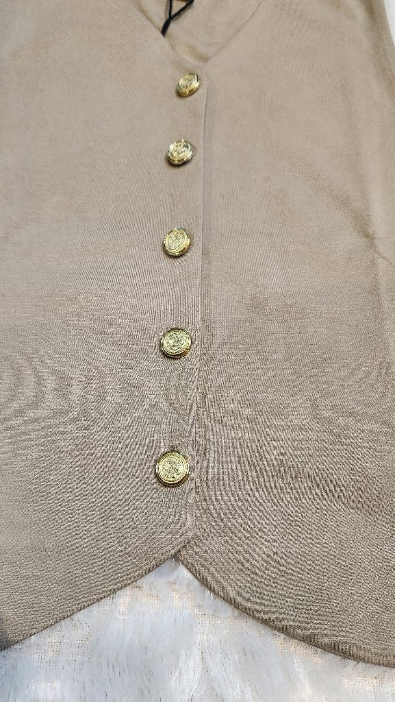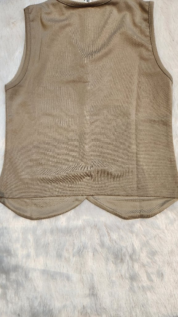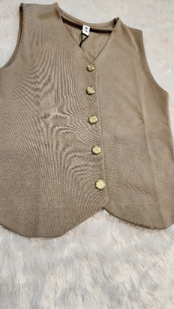 A stylish sleeveless vest featuring a v-neckline and decorative button closure. Made from a soft fabric, this vest is perfect for layering or wearing on its own during warmer weather.
