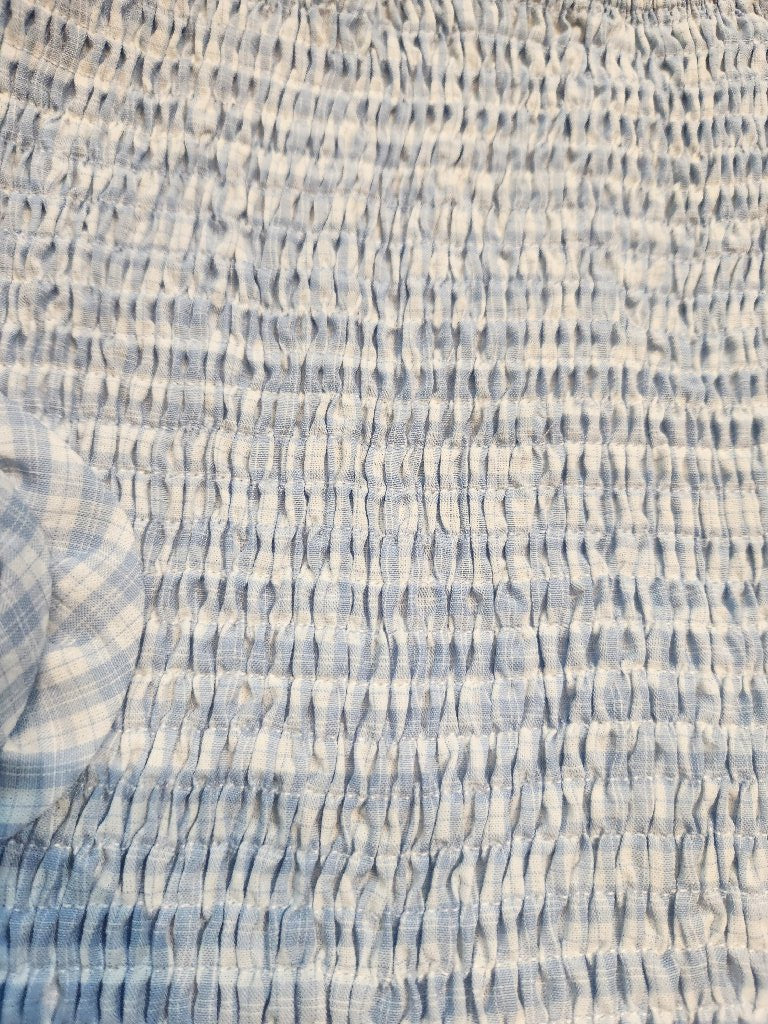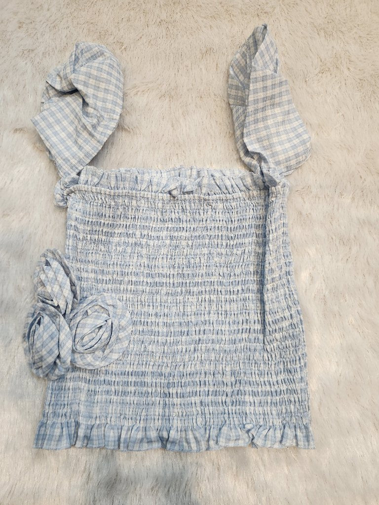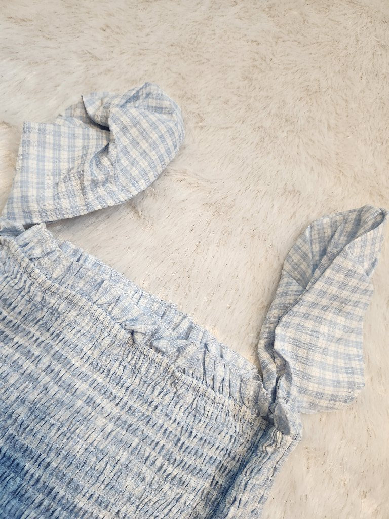 A charming smocked top featuring a light blue gingham pattern, designed with playful bow straps and a ruffled hem. The fabric is soft and breathable, perfect for warm weather. Ideal for casual outings or summer gatherings.