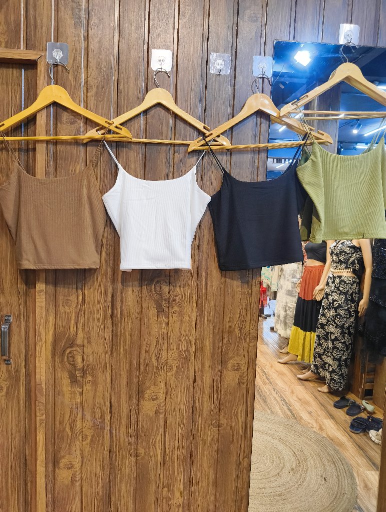 A set of stylish spaghetti strap crop tops available in multiple colors, perfect for summer wear. These tops feature a ribbed texture and a fitted design, making them versatile for casual outings or layering under jackets.