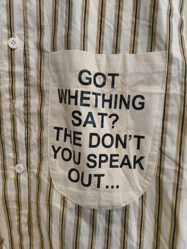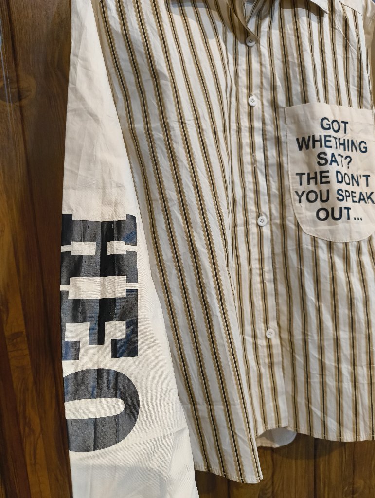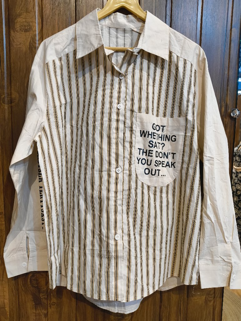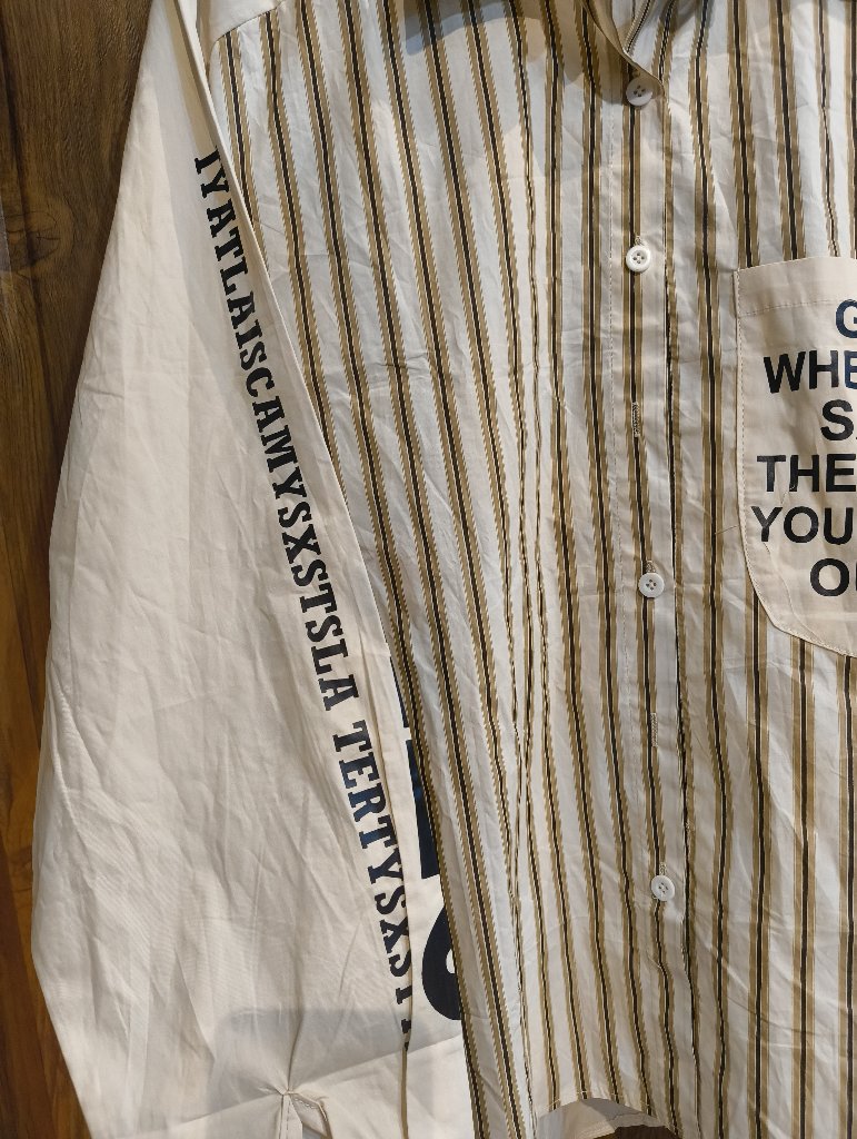 A stylish button-up shirt featuring a unique striped pattern with contrasting colors. The shirt includes a chest pocket and text detailing on the side, making it a trendy choice for casual outings. Perfect for layering or wearing alone.