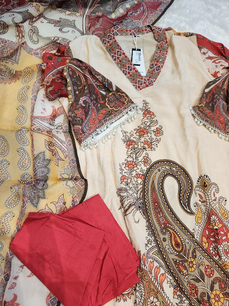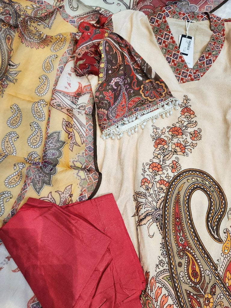 A beautifully designed traditional dress featuring intricate paisley patterns and vibrant colors. The dress has a flattering silhouette with short sleeves and a comfortable fit, making it perfect for festive occasions or casual wear.